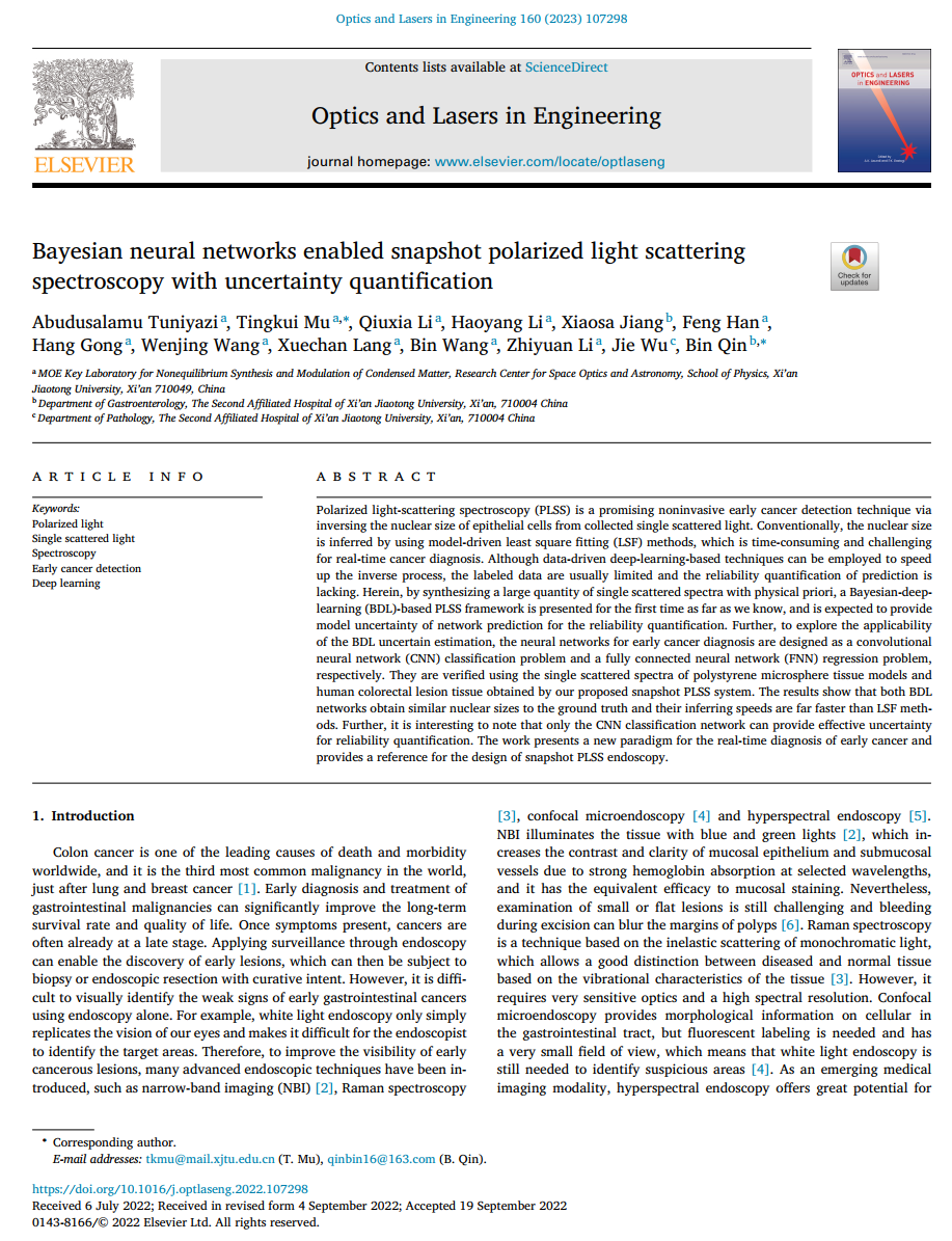 科研进展:博士生萨拉木《Optics and Lasers in Engineering》发表基于贝叶斯神经网络的快照式偏振散射光谱早癌诊断技术