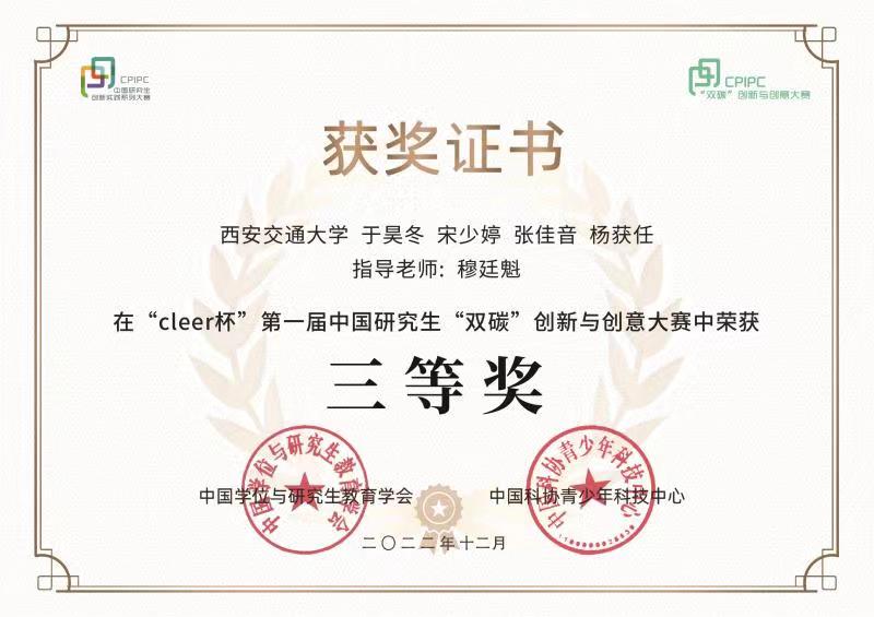 奖励荣誉:硕士研究生在2022年第一届中国研究生“双碳”创新与创意大赛中获三等奖