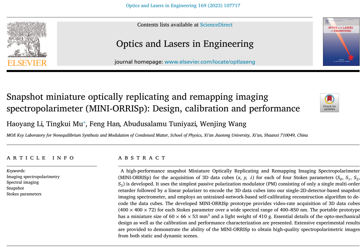 硕士生李昊阳《Optics and Lasers in Engineering》发表快照式迷你型偏振光谱成像技术及系统(MINI-ORRISp) 2023 IF: 4.6