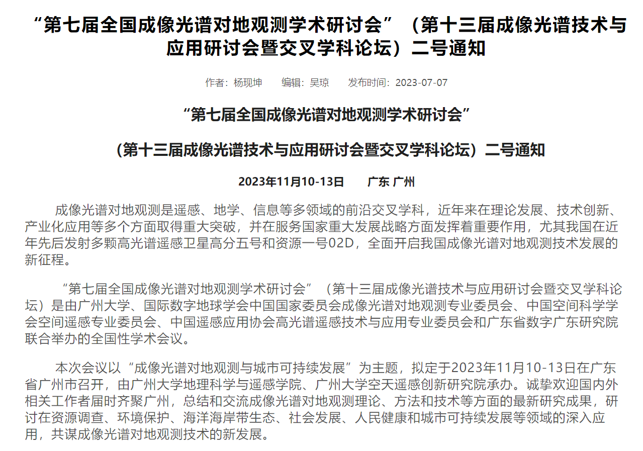 学术会议:受邀参加第七届全国成像光谱对地观测学术研讨会(特邀报告:偏振光谱多维信息实时成像遥感)
