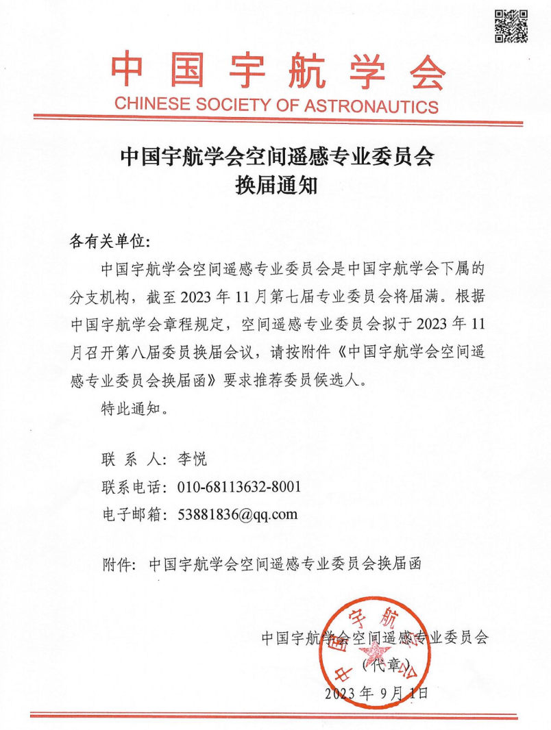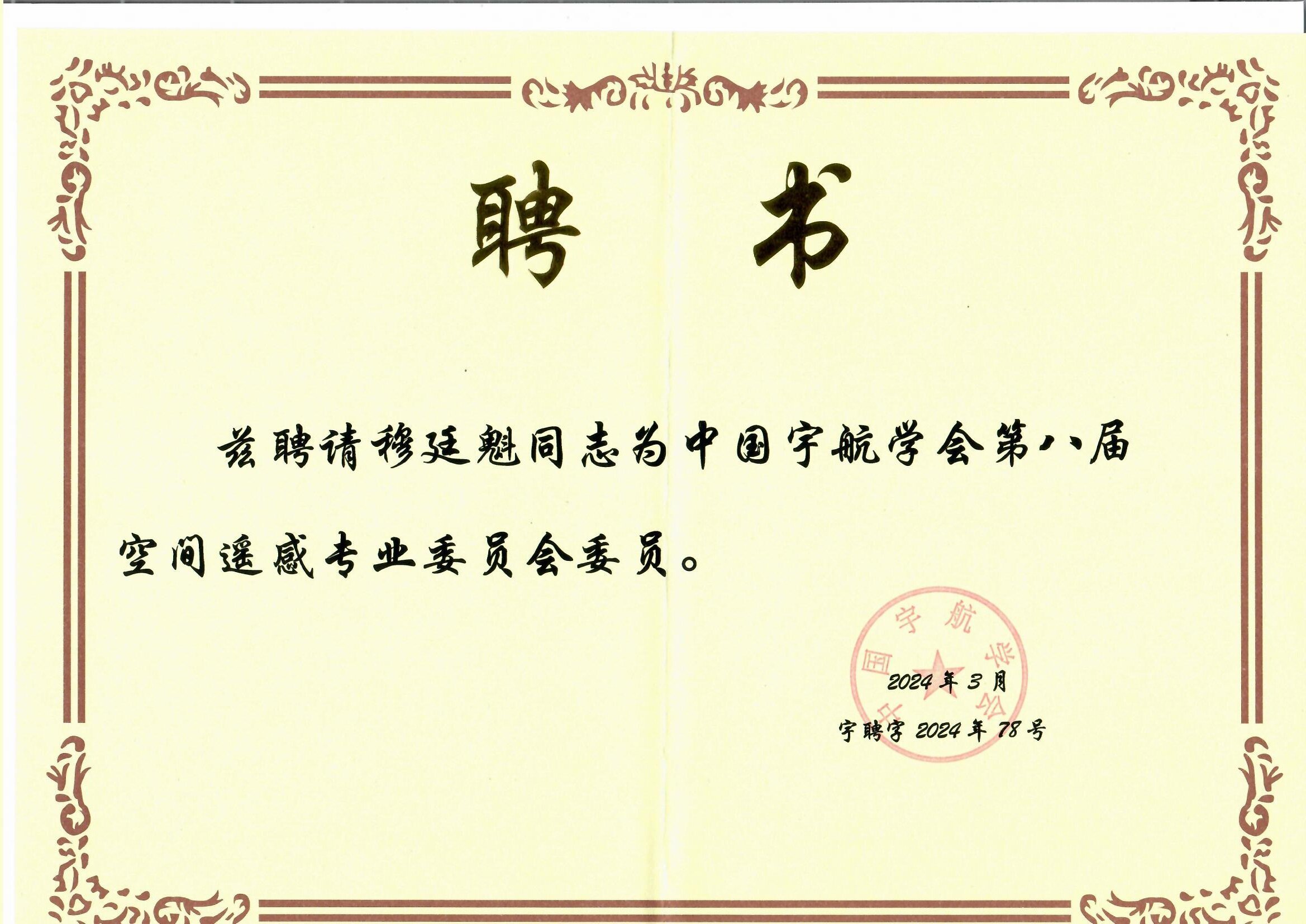 奖励荣誉:受聘“中国宇航学会空间遥感专委会”第八届委员