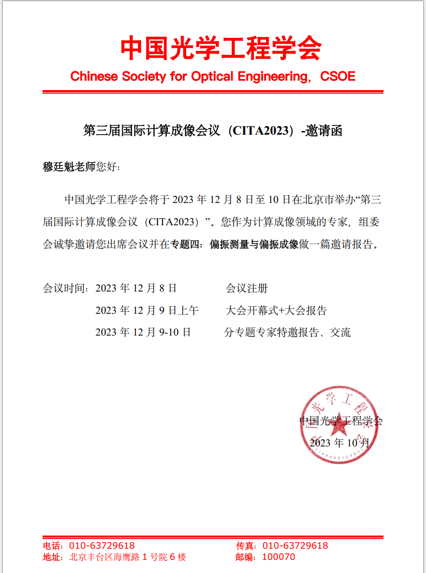 - 学术会议:受邀参加2023国际计算成像会议(特邀报告:计算偏振光谱成像)