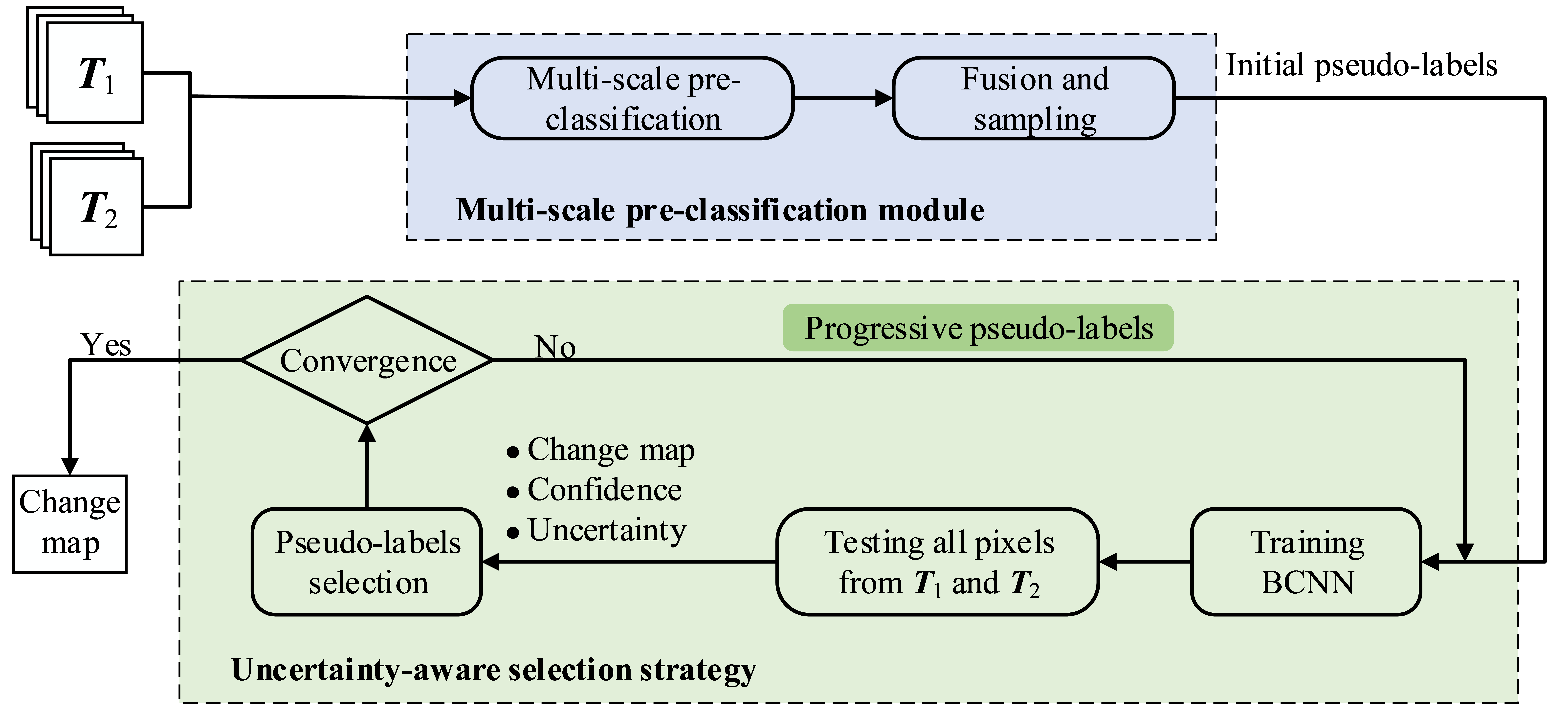 本文提出了一种用于HSI-CD的渐进式伪标签(PPL)框架,与现有基于固定伪标签的HSI-CD方法不同,PPL框架利用贝叶斯网络不断提高伪标签的质量和检测性能。PPL框架的有效性和泛化能力已在公开数据集上得到了充分验证。此外,PPL框架估计的不确定度值与预测误差吻合较好,使不确定度成为检测结果的可信度度量。如果存在真实标签信息,PPL框架可以通过将真实标签代替初始伪标签而转变为半监督学习模式。PPL框架适用于需要精确监测细微和强烈变化的场景,例如植被状态、水质、作物生长和土壤质量的监测。