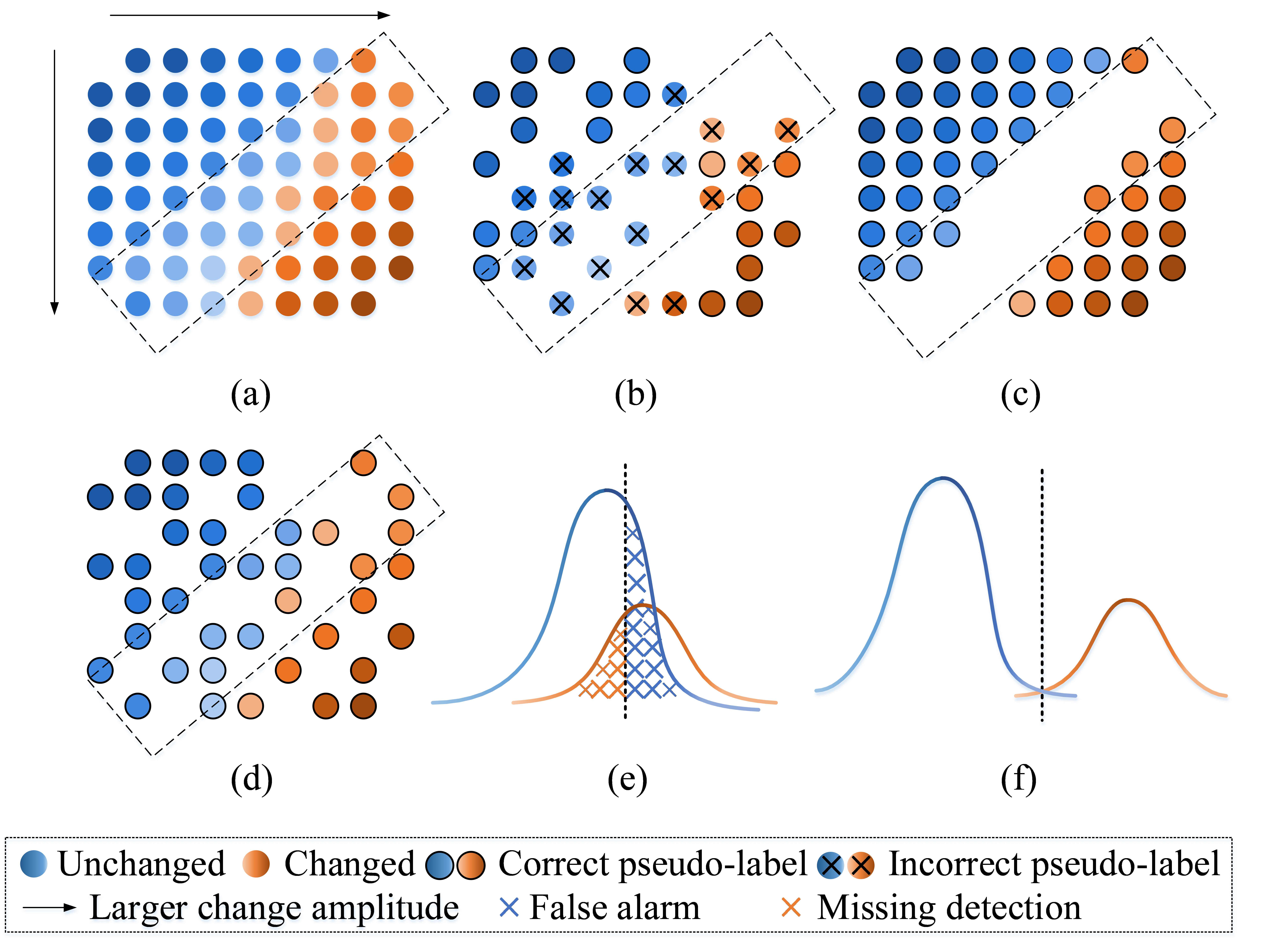 变化检测(CD)是一项通过分析双时图像获取变化信息的任务;高光谱图像(HSI)蕴含着丰富的光谱信息,可有效地表征多样的地物信息。高光谱变化检测(HSI-CD)是一项利用双时相高光谱图像获取更精细的变化信息的任务,已被广泛应用于城市扩展、土地覆盖制图、环境监测等领域。HSI-CD目的是检测出强烈变化和微弱变化(相似地物之间的变化),抑制虚假变化(由光照、季节等不同拍摄条件引起的在同一地物上的光谱差异)。近年来,随着深度学习方法的不断涌现,基于伪标签的HSI-CD方法逐渐受到关注,其无需依赖真实标签的特性使其具备广泛的应用潜力。然而,现有的基于伪标签的HSI-CD方法容易引起虚警过多或者漏检过多的情况,如图1。因此,提升伪标签的质量对于改善检测性能至关重要。