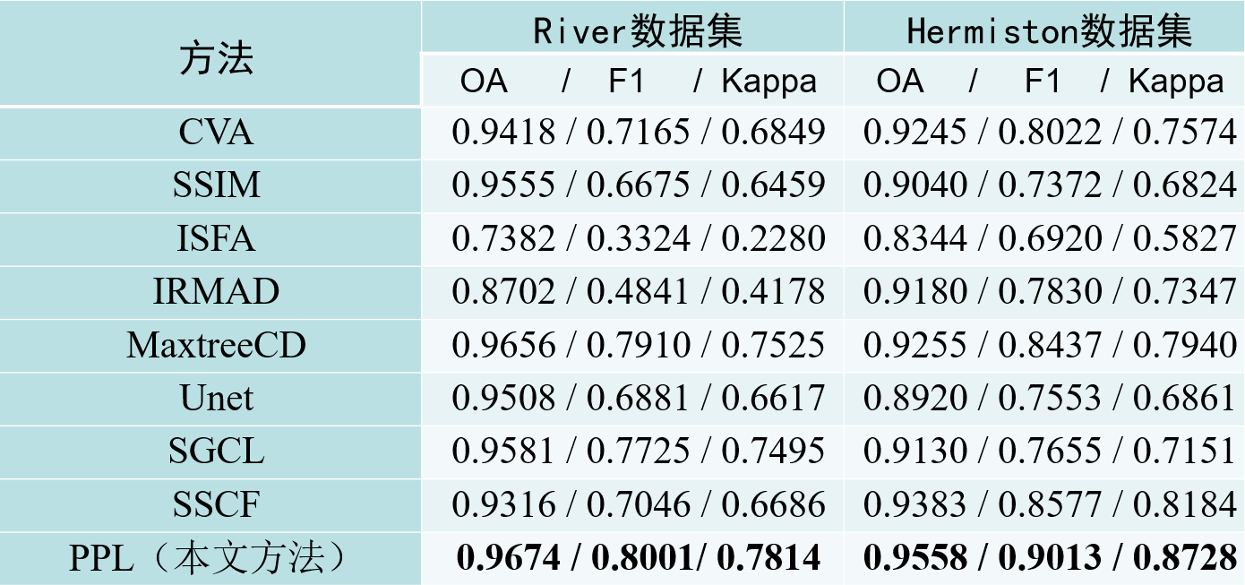 可见,PPL框架的结果与参考变化图最为一致,PPL能够较为完整的检测到Hermiston数据集中的微弱变化,还能抑制River数据集中的大量虚假变化。