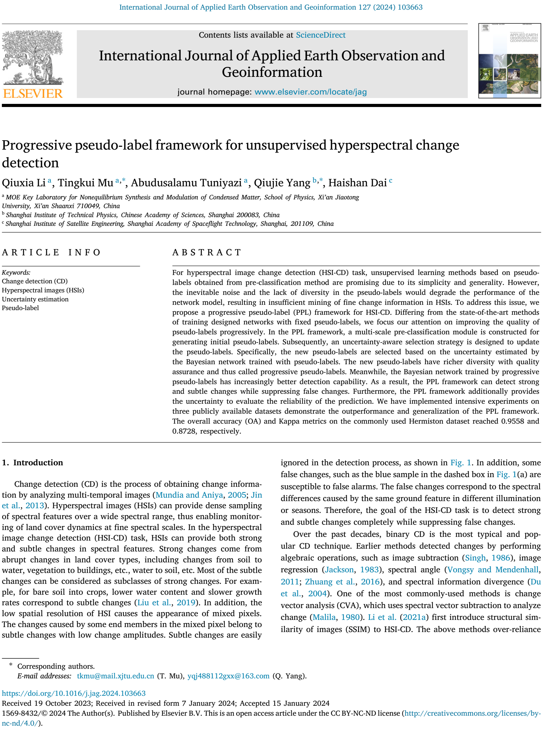 Qiuxia Li(李秋霞), Tingkui Mu*(穆廷魁), Abudusalamu Tuniyazi(阿卜杜萨拉木 图尼亚孜), Qiujie Yang*(杨秋杰), Haishan Dai(代海山), "Progressive pseudo-label framework for unsuperised hyperspectral change detection", International Journal of Applied Earth Observation and Geoinformation 127, 103663 (2024).(中科院一区top,影响因子为7.5)
