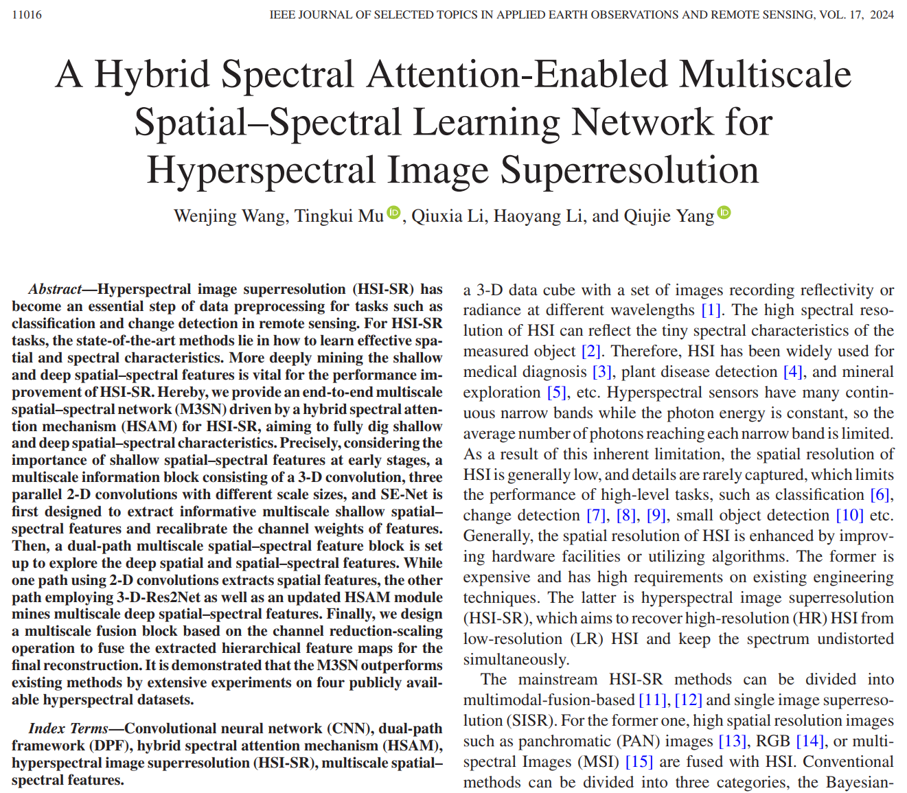 科研进展:硕士生汪文静遥感知名期刊《IEEE J-STARS》(2024 IF: 4.7,2区)发表基于注意力机制的高光谱图像超分辨方法