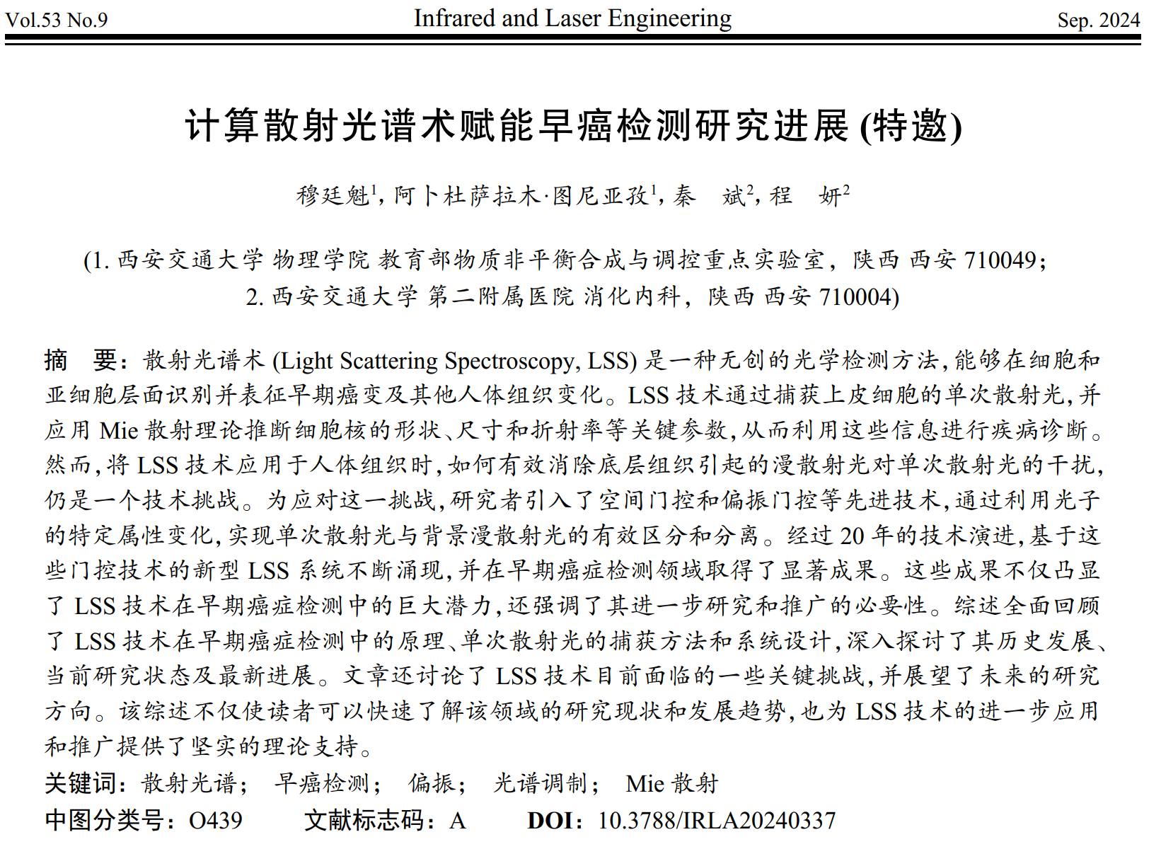 鉴于团队前期的研究进展,受邀为国内知名光学期刊《红外与激光工程》撰写题为“计算散射光谱术赋能早癌检测研究进展”的综述论文,详述了基于上皮散射光的早癌诊断方法。