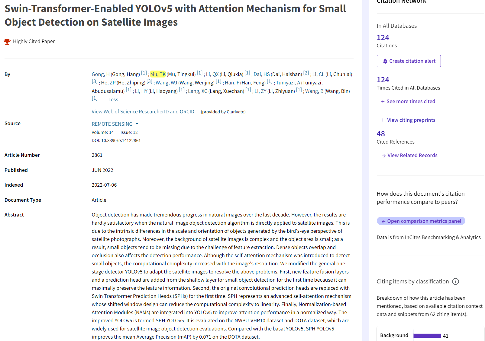 奖励荣誉:硕士生龚航遥感期刊《Remote Sensing》Transformer注意力机制赋能YOLOv5的卫星遥感图像小目标检测方法 为 “ESI高被引论文”