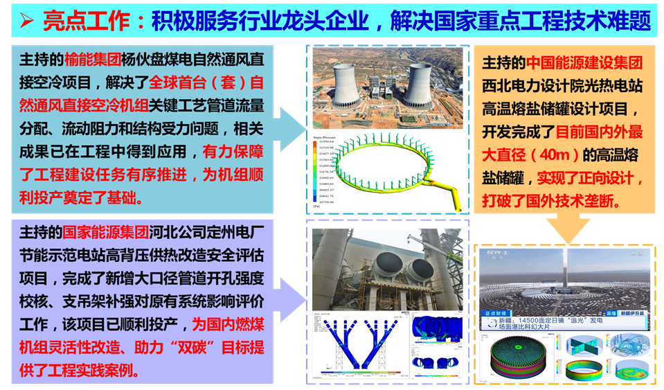 2007-2014年曾在中国电力工程顾问集团公司西北电力设计院从事火力发电厂机务设计工作,作为项目骨干成员完成了世界首台1000MW等级超超临界空冷机组示范工程(华电灵武二期工程)、世界首台汽轮机高位布置发电机组(国华锦界三期工程)、世界首台大型电站自然通风直接空冷(NDC)系统(榆能杨伙盘煤电一体化工程)、国内首台国产化600MW直接空冷机组(中电投通辽电厂三期)、国内首台350MW超临界直接空冷机组(中电投临河动力站工程)等5项首台(套)重大技术装备示范工程的关键核心技术攻关和应用示范工作;作为机务专业负责人完成了神华神东店塔电厂2×660MW空冷系统工程、中电投宁夏临河动力站2×350MW空冷系统工程、新疆众和(2×150MW)直接空冷系统工程、神木电石集团电石资源循环综合利用2×150MW发电工程等大中型发电设计项目共11项(累计工程造价逾百亿,其中投产运行装机容量2660MW,年均发电量超过100亿度);作为第一完成人完成了大型电力工程专题报告30余项,撰写企业标准及设计规范4项;作为主要完成人获得电力工程科学技术进步奖一等奖1项、中国能源建设集团科学技术奖三等奖1项、中国电力工程顾问集团技术创新一等奖1项,中电工程西北电力设计院技术创新一等奖3项,二等奖1项。