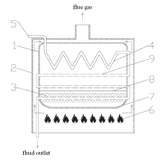 该发明提出了一种换热器,借助相变换热的高传热系数,充分利用高温火焰的热量,实现第一次吸热;同时通过在烟道夹层布置翅片管完成对烟气余热的第二次吸热,实现了对燃气燃烧产生的热量的充分利用,显著提高了对以高温烟气为热源的设备的换热效率。该换热器以高温火焰或高温烟气作为热源,至少包括双层壳体。其中,内层壳体的内部空间下部,充入液态相变介质,上部设置至少一根盘管。被加热流体在盘管内流动。盘管下游侧管路穿出内层壳体后,在双层壳体之间的空腔内形成至少一根环绕管道。内层壳体的底部换热板位于热源上方。双层壳体之间的空腔形成烟气通道,热源对内层壳体的底部换热板加热后,烟气从内层壳体外侧底部四周沿烟气通道上升,并将热量传递给环绕管道内的被加热流体(如下左图)。采用本发明换热器的供热设备可显著提高热利用率。如用于燃气热水器中,可显著改善现有燃气热水器换热温差小、热量利用不够充分、出口水温稳定性不佳的问题,环境效益和经济效益显著,能够达到节能减排的目的(如下右图)。