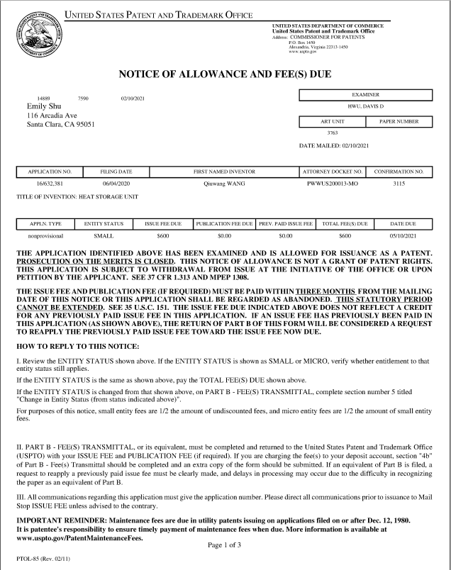 2021年2月24日,CEMTA课题组收到美国专利局授权通知书。授权专利通知书部分截图: