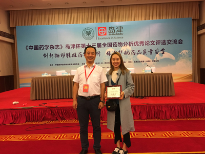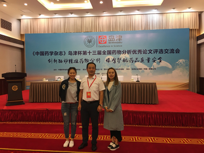 内容: 2017年9月14日至9月17日,王嗣岑教授、硕士生隋月及胡琪同学在成都参加“《中国药学杂志》岛津杯第十三届药物分析优秀论文评选交流会”。两位同学分别作了分会口头报告。胡琪同学的论文“A431细胞膜色谱法筛选铁棒锤中潜在抗肿瘤活性成分”获优秀论文三等奖。