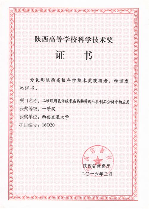 文章标题:团队成果“二维联用色谱技术在药物筛选和乳制品分析中的应用”获陕西高等学校科学技术奖励一等奖
