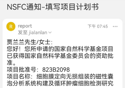 近日,国家自然科学基金委员会公布了首批国家自然科学基金青年学生项目(博士研究生)立项项目,博士生贾兰兰申报的《细胞膜定向无损组装的磁性囊泡分析系统构建及循环肿瘤细胞检测研究》项目获得资助。项目批准号为823B2098。