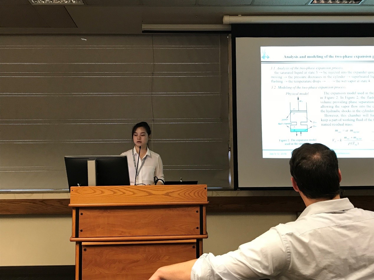 课题组博士研究生张曌完成的文章 “Numerical Simulation of Discharge Process in the Single Screw Compressor” 和硕士研究生王其完成的 “Simulation of the Superheated Water Expansion Process in a Cylinder with Moving Piston” 被该会议接收。7月9日,张曌博士应邀前往普渡大学参加会议,完成了两篇论文的主题汇报,会上她详细介绍了单螺杆压缩机排气过程的模拟方法以及增设闪蒸室的膨胀过程性能比较,并在汇报完毕后解答了相关学者提出的学术问题。张曌博士深入浅出的分析和叙述受到学者们的高度评价。