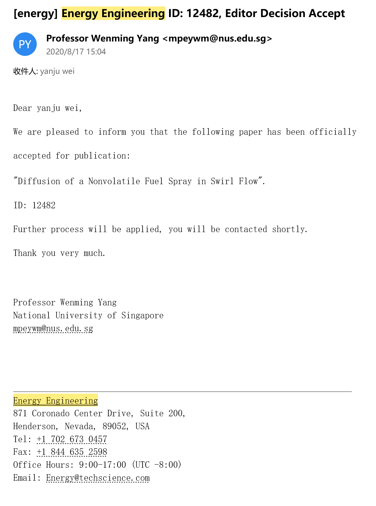 - “Diffusion of a Nonvolatile Fuel Spray in Swirl Flow” 被 Energy Engineering录用!