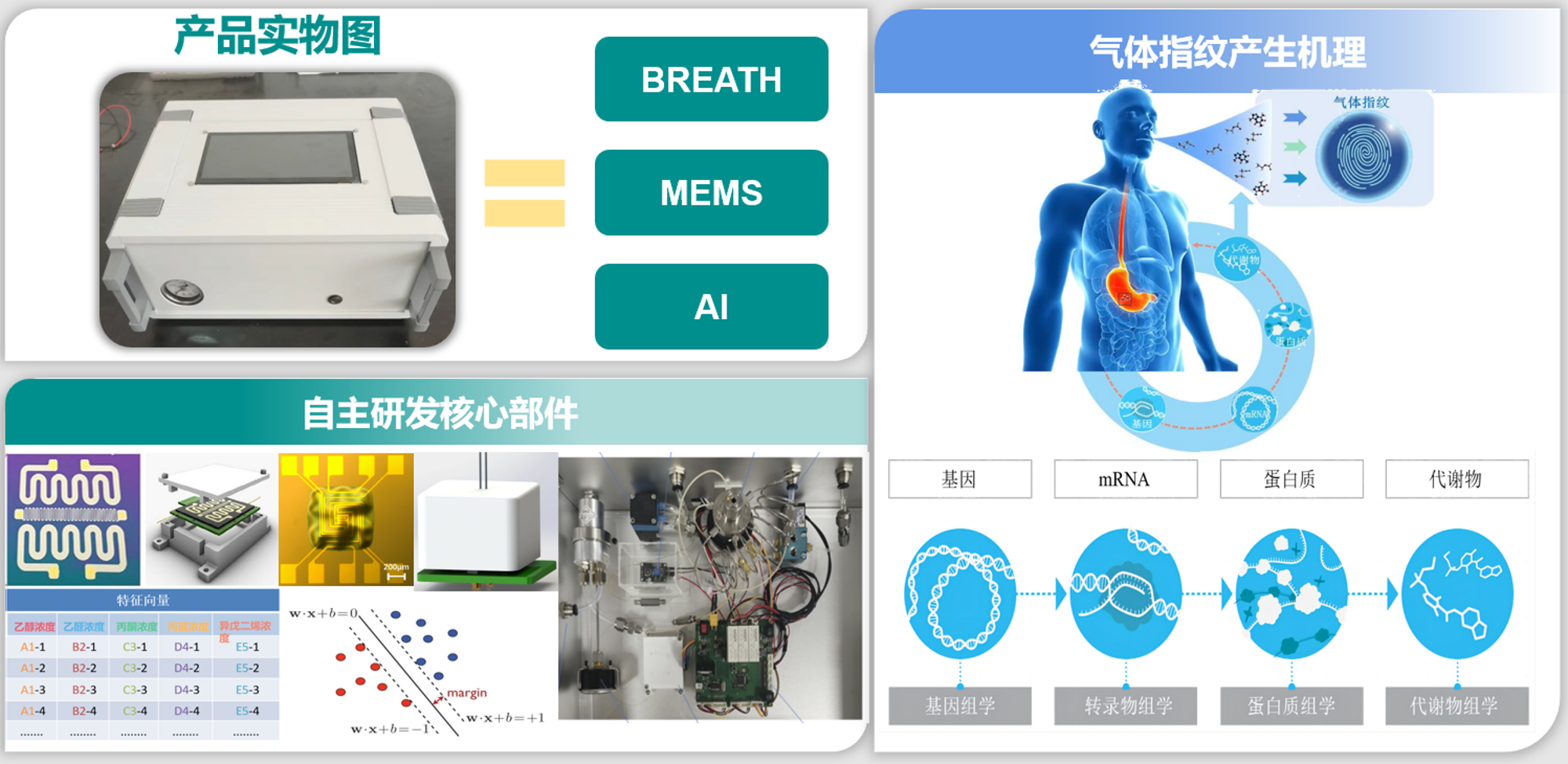 微纳呼吸诊断技术具有检测灵敏度高、响应速度快便携性好等优点,在重大疾病筛查、个人健康跟踪、毒品检测、ZJ检测具有很好应用前景。项目基于微色谱与高灵敏度气体传感技术,开发高精度的多组分检测技术,实现了不同场景特征气体的高精度检测,从根本消除了气体的交叉干扰。目前呼吸诊断技术在糖尿病、NAFLD、肺病等疾病早期筛查中进行应用。