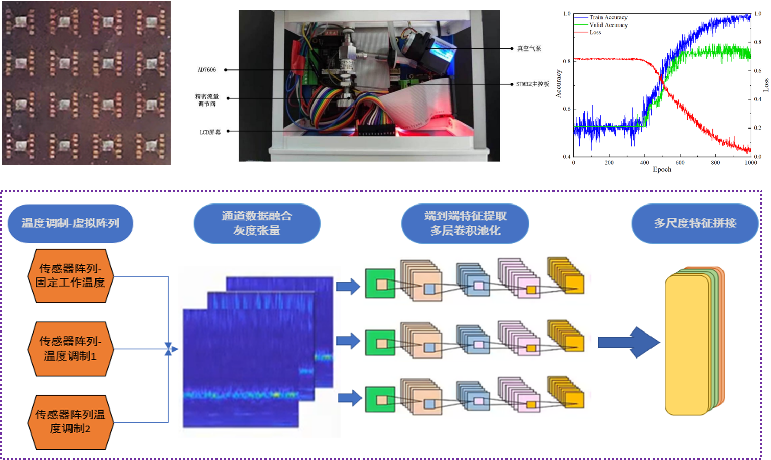 基于微纳传感器,构建具有对复杂气体具有互补特征的传感阵列,结合各种智能算法,实现气体的定性识别和定量检测,解决微纳气体传感器的交叉干扰难题。该技术在呼气分析、电力设备状态监测等场景等到应用。