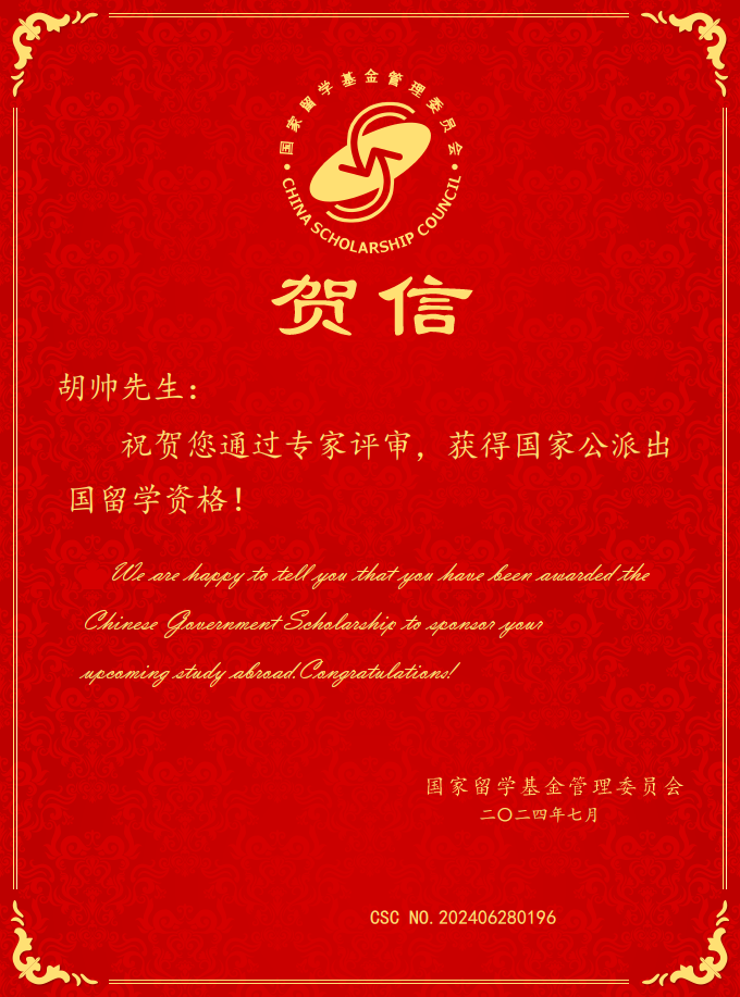 课题组胡帅博士生获得国家公派出国留学资格(CSC联培)