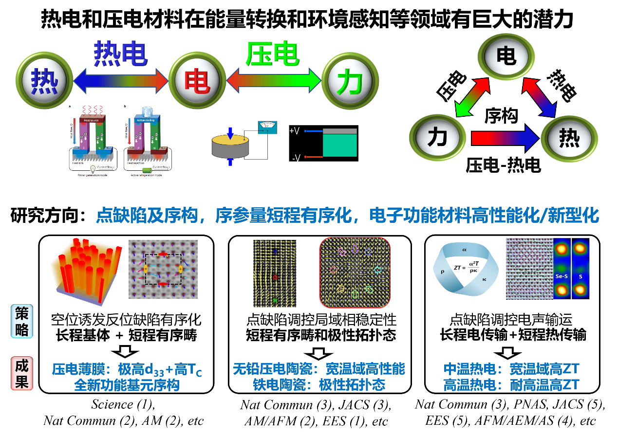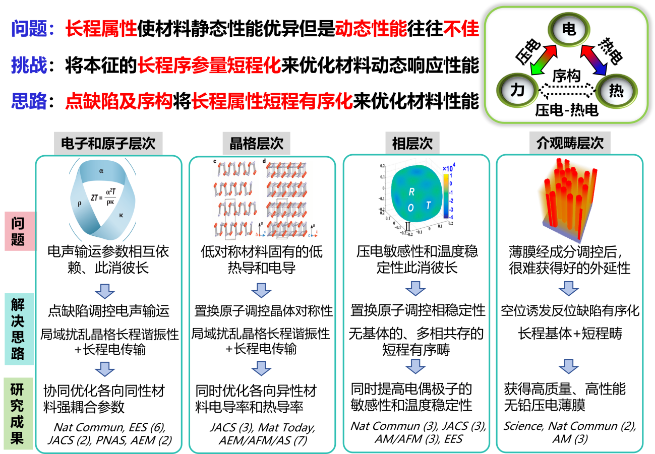 课题组围绕上述国家对于高效功能材料的战略需求,从事可实现力-电-热环境感知和能量转换的铁电/压电和热电材料的结构设计、机理分析及性能调控。课题组通过调控点缺陷实现长程序参量的短程化,从而优化铁电/压电和热电材料动态响应,基于此思路开展了如下工作: