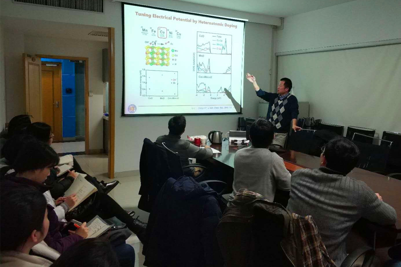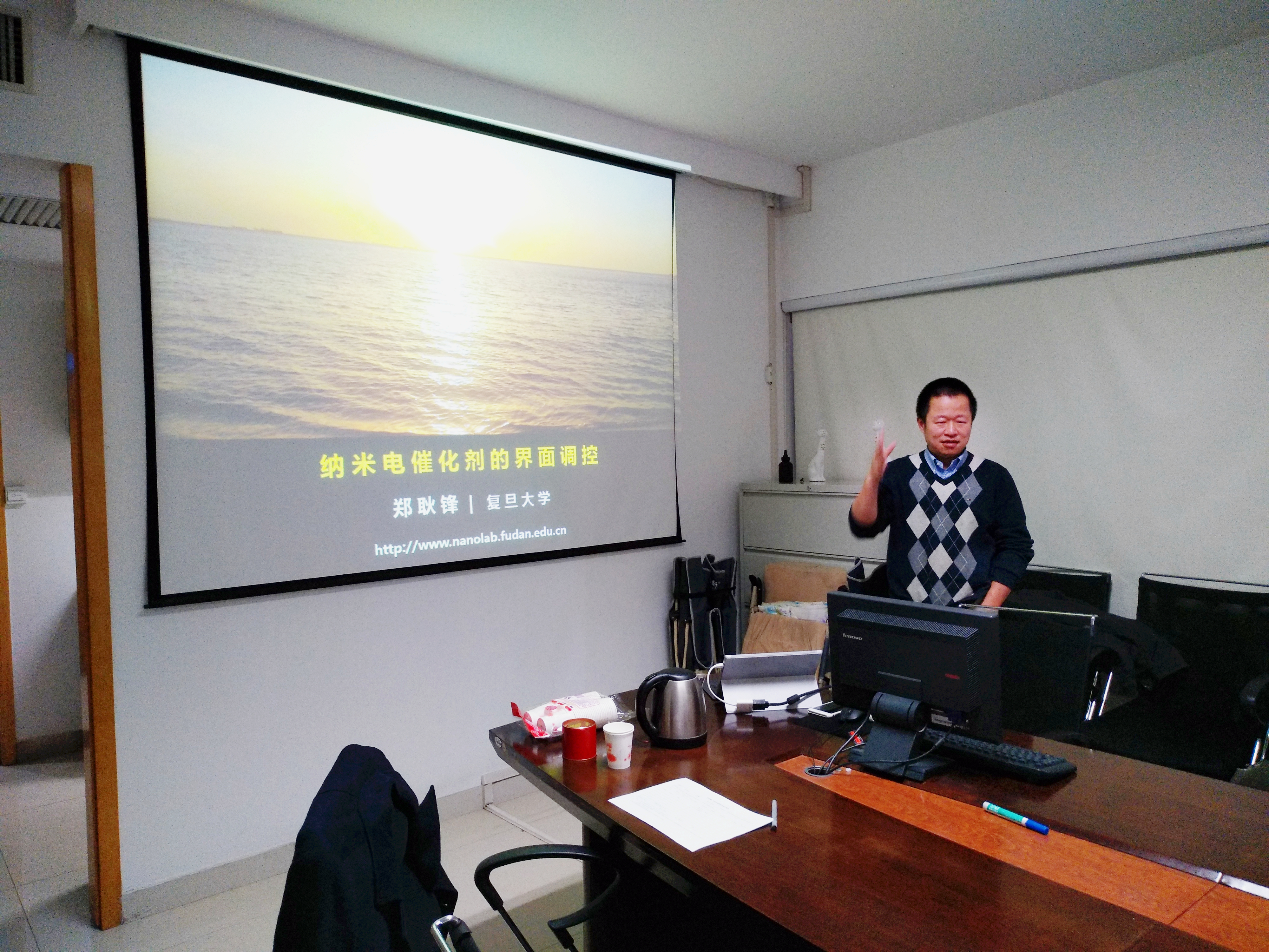 内容: 2018年1月9日,应韩晓刚老师邀请,复旦大学郑耿锋教授来我组进行访问交流并作学术报告,报告题目为《纳米电催化剂的界面调控》。 郑耿锋,复旦大学教授、博士生导师,国家优青。2000年复旦大学化学系本科毕业,2007年获得美国哈佛大学化学与化学生物系博士学位,2007—2010年在美国西北大学化学系从事博士后研究,2010 年起在复旦大学先进材料实验室和化学系担任教授与博导。已在国际著名学术期刊上发表论文120余篇,邀请专著与章节 4部,论文的总他引次数 9000多次(h-index 40),有17篇入选ESI高引论文。目前兼任国际期刊J. Colloid and Interface Science的副主编,J. Materials Chemistry A杂志的编委。获得的荣誉包括:上海市青年五四奖章(2017)、上海市育才奖(2016)、宝钢基金会优秀教师奖(2015)、上海市东方学者跟踪计划(2015)、上海市曙光计划(2015)、中国化学会青年化学奖(2014)、国家基金委优秀青年科学基金(2013)、复旦大学港爱赞助优异奖教金(2013)、上海市东方学者特聘教授(2012)、教育部新世纪优秀人才(2011)、上海市浦江人才(2010)、美国西北大学杰出科研人员奖(2009)、美国材料科学会博士生金奖(2006)、美国纳米医学会青年科学家奖(2006)、与美国哈佛大学优秀教学奖(2004)等。主持科技部重大科学研究计划课题、国家基金委优青、面上项目、上海市科委重点项目、教育部博士点基金等课题。