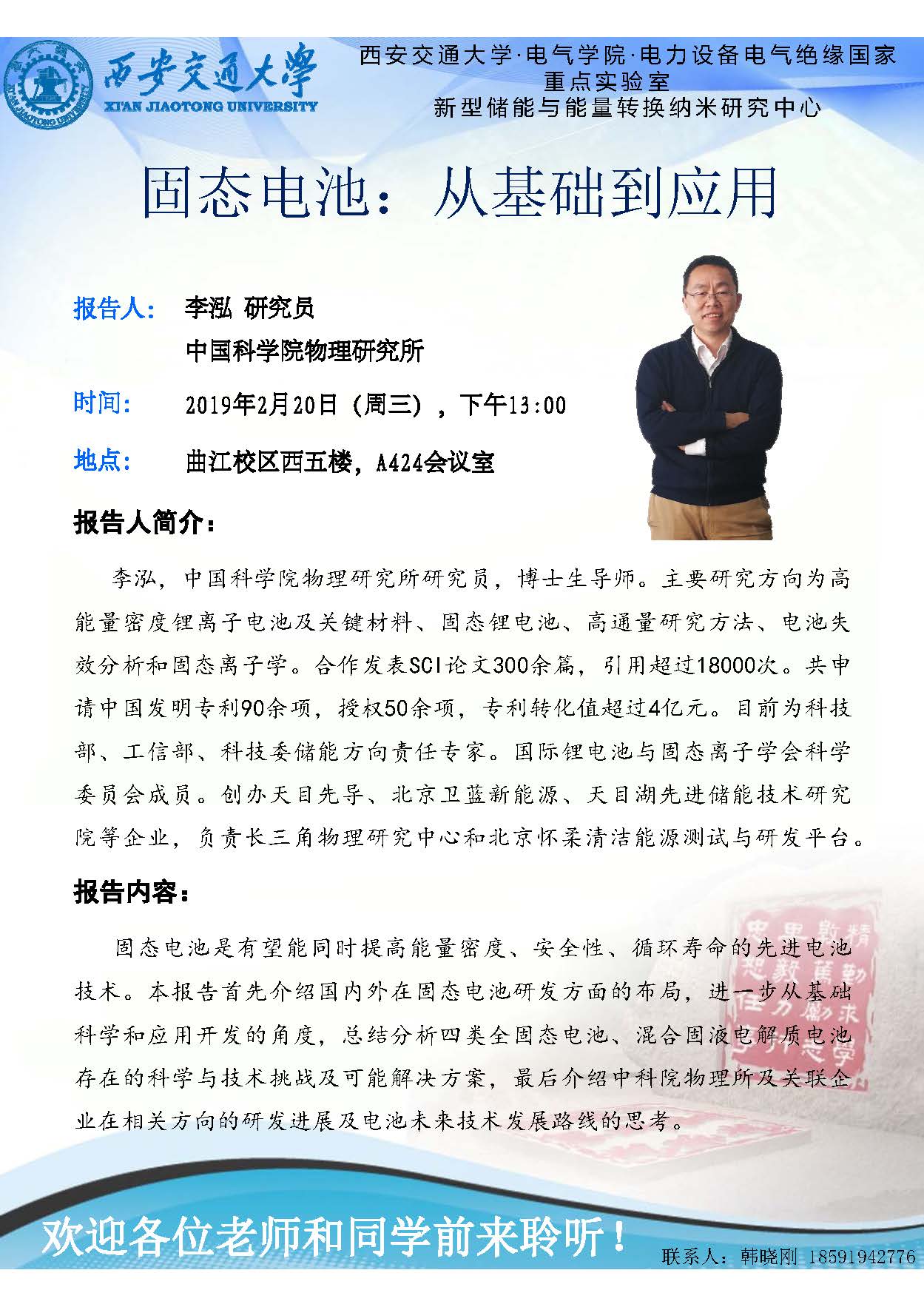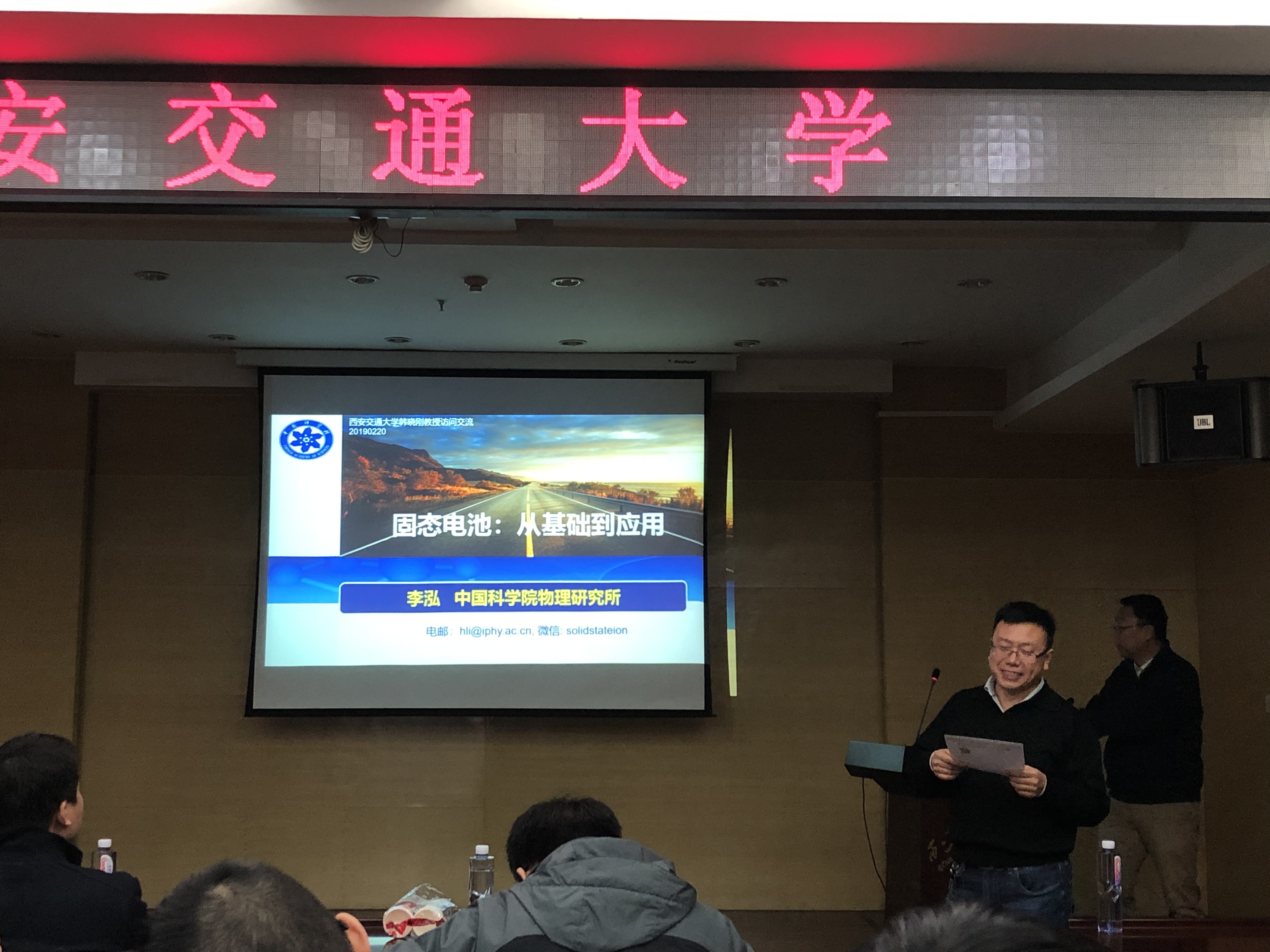内容: 2019年2月20日,应韩晓刚老师邀请,中国科学院物理研究所李泓研究员到访,并做了精彩的学术报告,报告题目为《固态电池:从基础到应用》。