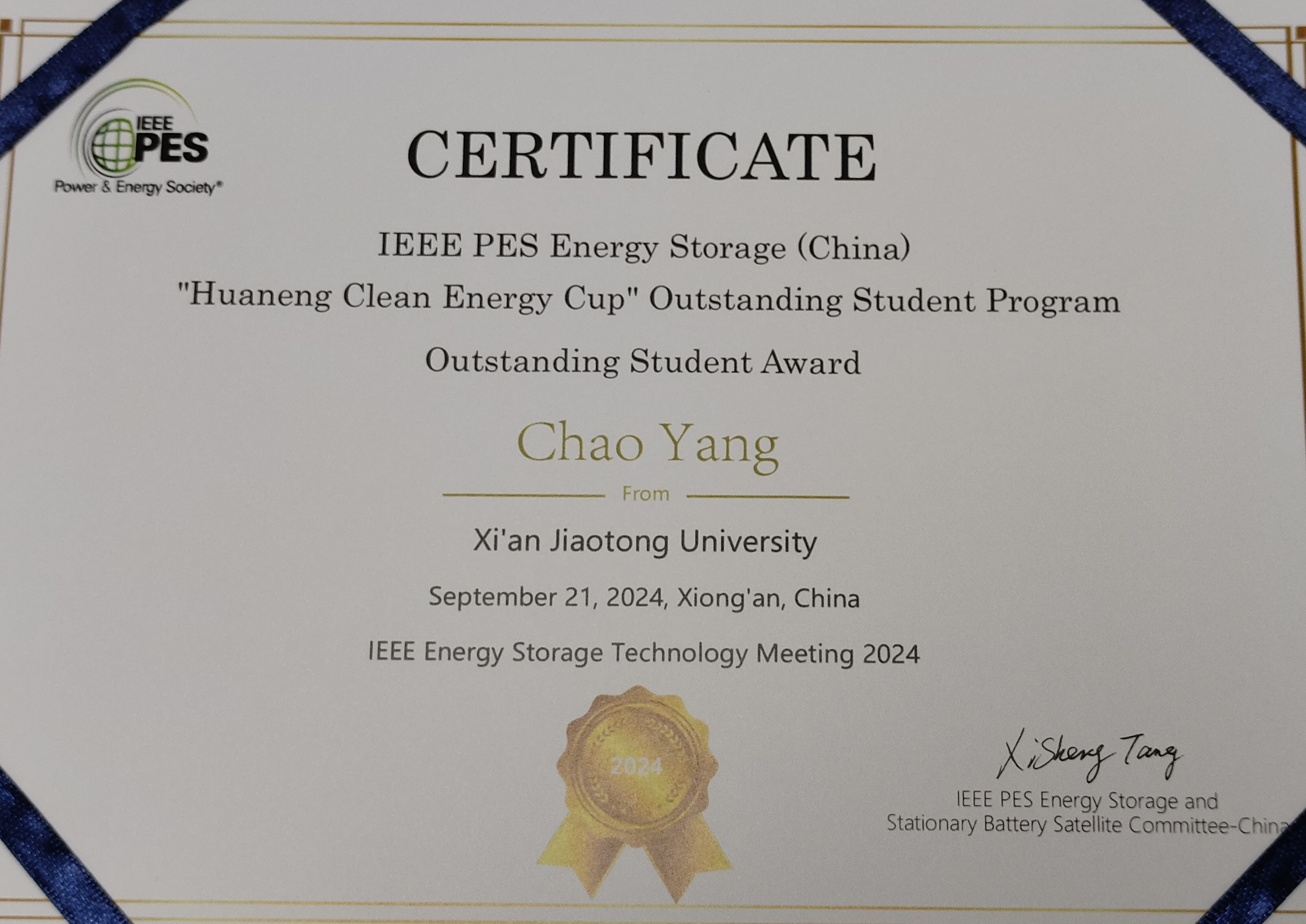 内容: 课题组博士生杨超于2024年9月20日至21日,作为IEEE PES储能技术委员会厂站直流电源与供配电分委会理事成员,参加了在雄安新区召开的IEEE PES 2024储能技术大会,获得IEEE PES储能(中国)“华能清能杯”优秀学生计划–优秀学生奖(IEEE PES Energy Storage (China)"Huaneng Clean Energy Cup" Outstanding Student Program–Outstanding Student Award)和中国华能清洁能源研究院提供的1万元奖学金。