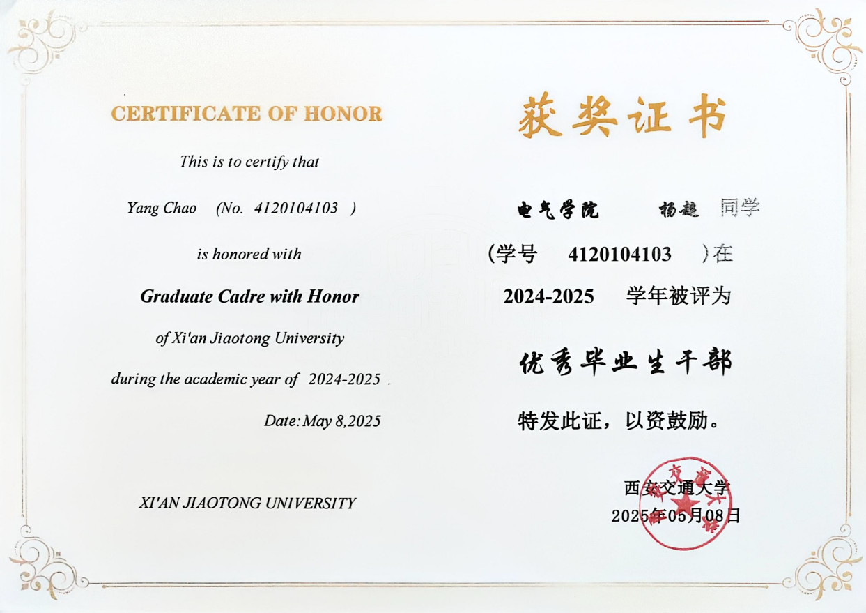 近日喜讯传来,课题组毕业生杨超同学,凭借其在研究生期间卓越的科研能力和热心的集体服务工作,在2024-2025学年评选中,被授予西安交通大学“优秀毕业生干部”荣誉称号。