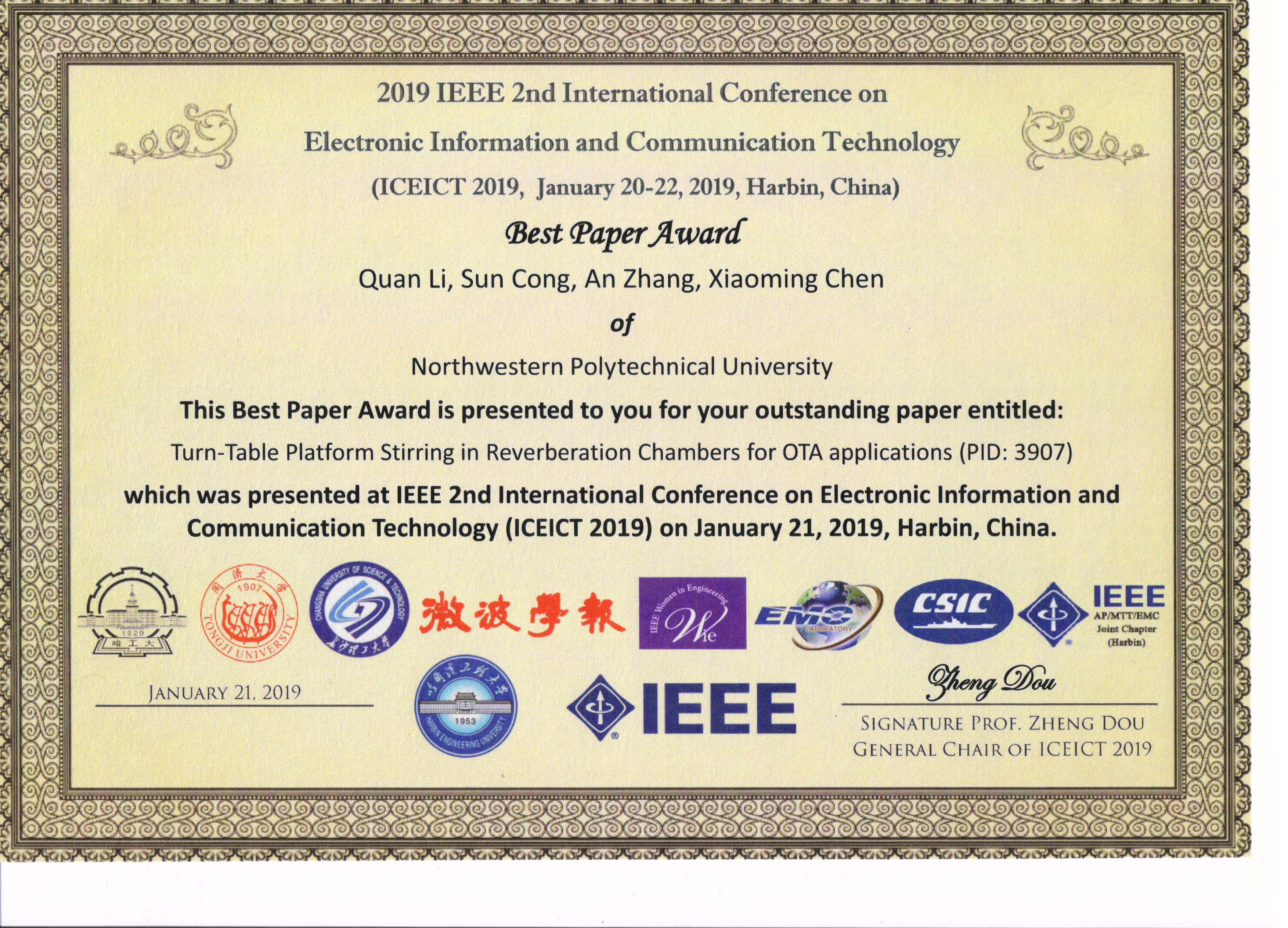 与西工大合作的关于混响室的工作获得最佳论文奖。