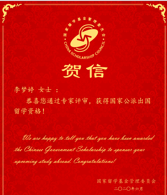 恭喜李梦婷同学顺利毕业,并获得CSC奖学金赴丹麦奥尔堡大学攻读博士学位!