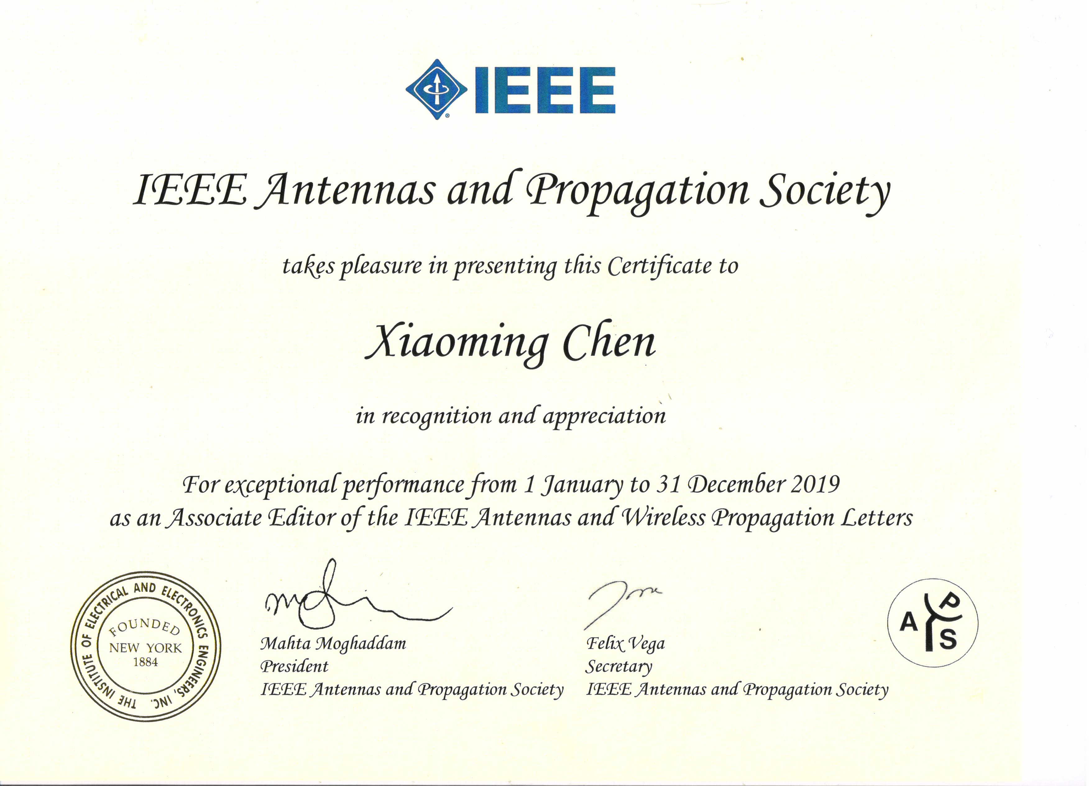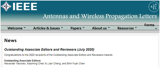 很荣幸再次被IEEE天线与传播协会授予杰出副编辑奖(Outstanding Associate Editor Award)。这是我连续第三年获得该奖。