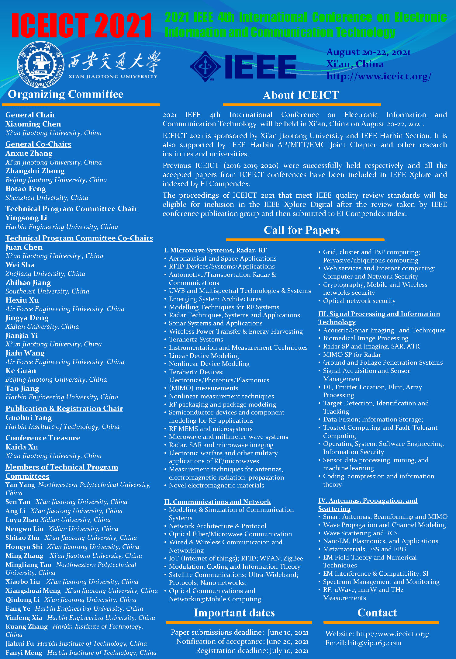 ICEICT 2021 will be held in Xi’an, China on August 20-22, 2021, sponsored by Xi'an Jiaotong University and IEEE Harbin Section. It is the fourth forum to provide a platform for bringing together researchers, practitioners, and academia to present and discuss ideas, challenges and potential solutions on established or emerging topics related to research and practice in antennas, information technology and communication systems.