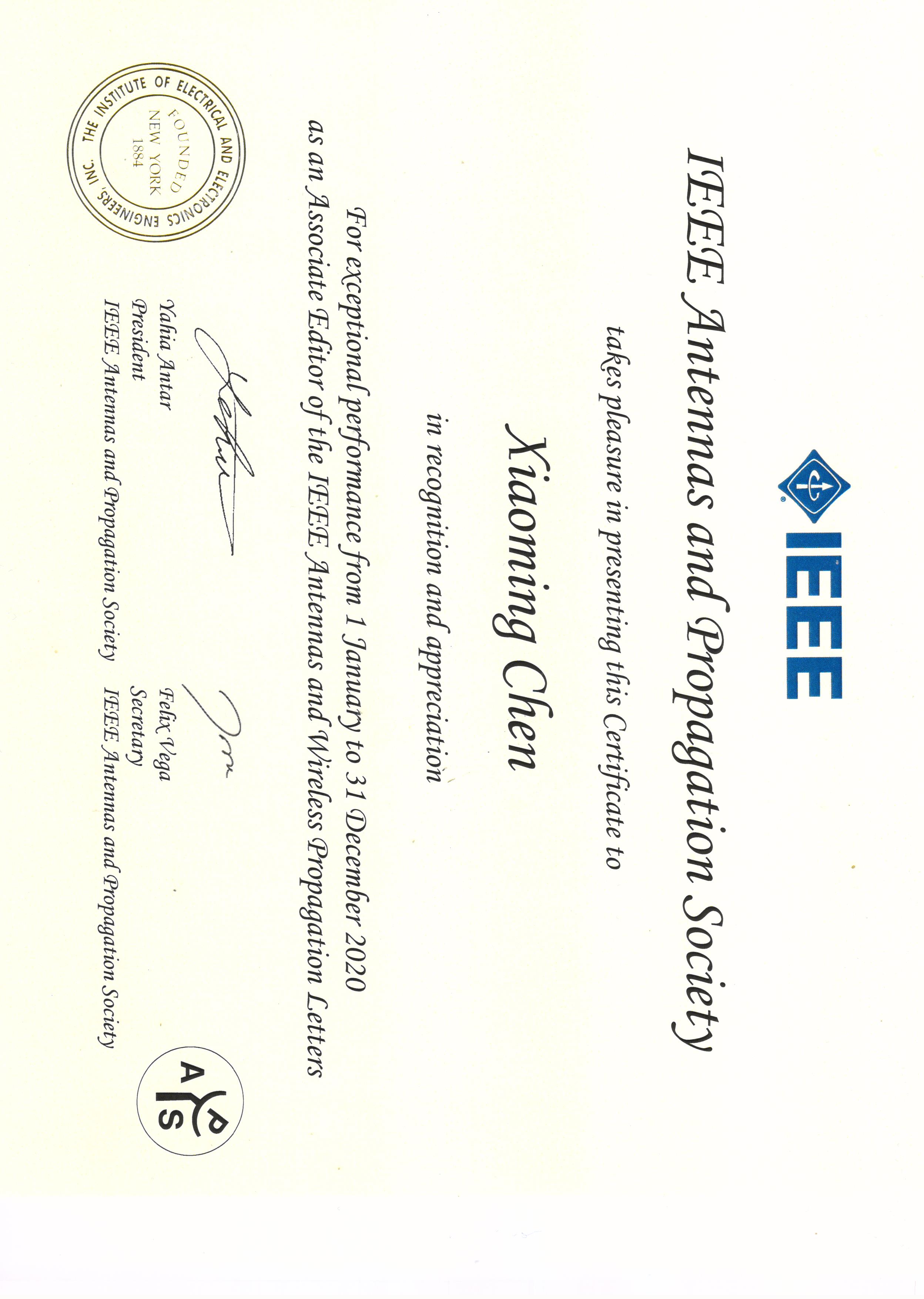 很荣幸再次被IEEE天线与传播协会授予杰出副编辑奖(Outstanding Associate Editor Award),这也是我连续第4年获得该奖。