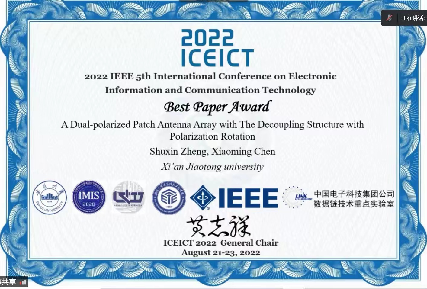 课题组博士生郑舒心同学在IEEE国际学术会议(the 5th IEEE International Conference on Electronic Information and Communication Technology)上获得最佳会议论文奖!