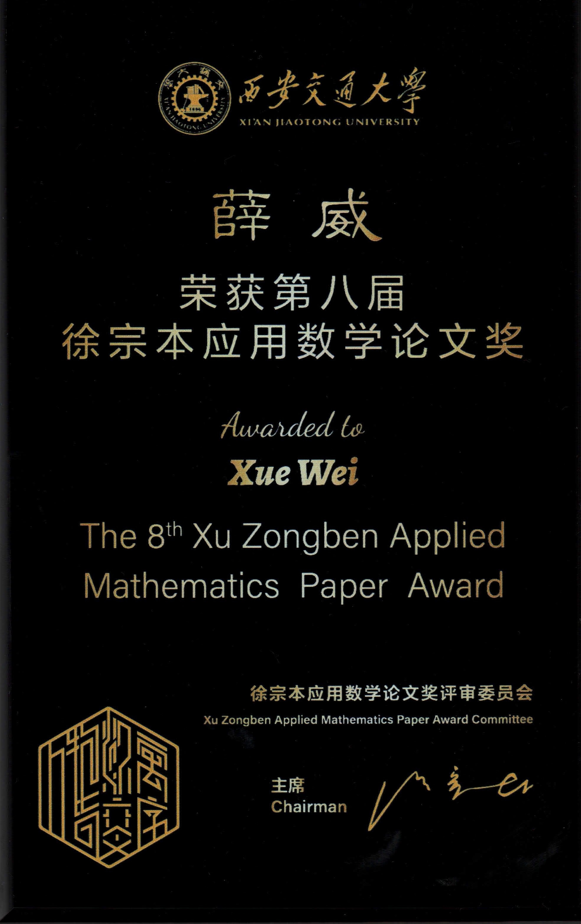 祝贺课题组薛威同学(现西工大副教授)获得徐宗本应用数学奖