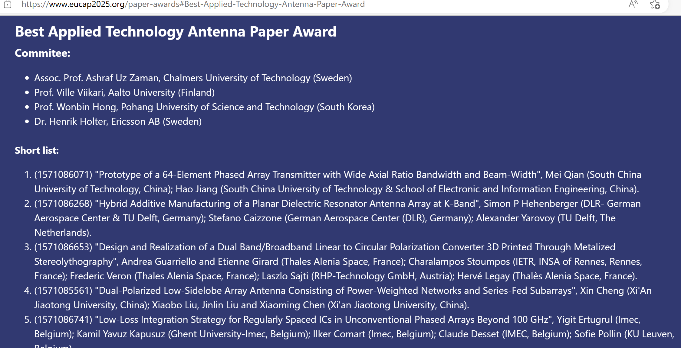 祝贺课题组成鑫同学关于间隙波导阵列天线的论文入围2025年欧洲天线大会EuCAP最佳论文奖