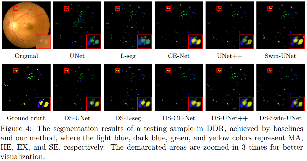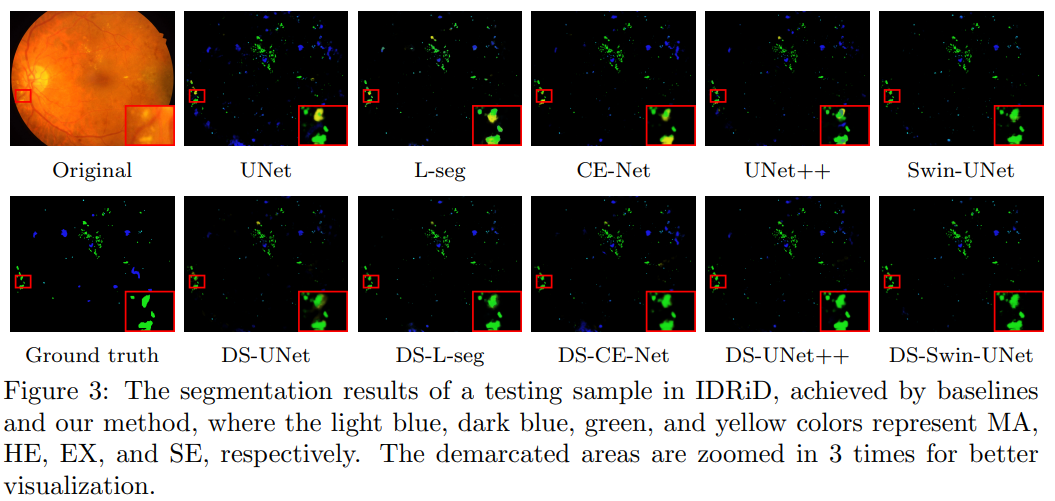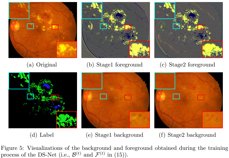 整个网络框架包括两个子网络:S-Net和D-Net,分别对应EM算法的E步和M步。D-Net的目的是生成干净的眼底背景图,从而完成眼底图像前背景的分离。S-Net则以前景部分作为输入,执行病灶分割任务。相比传统的分割方法而言,DS-Net不仅具有一定的可解释性,且将任务解耦为了两个更容易完成的子任务。通过将去除了背景干扰的前景病灶输入分割网络,获取了更优越的分割性能。部分分割结果的可视化展示如下: