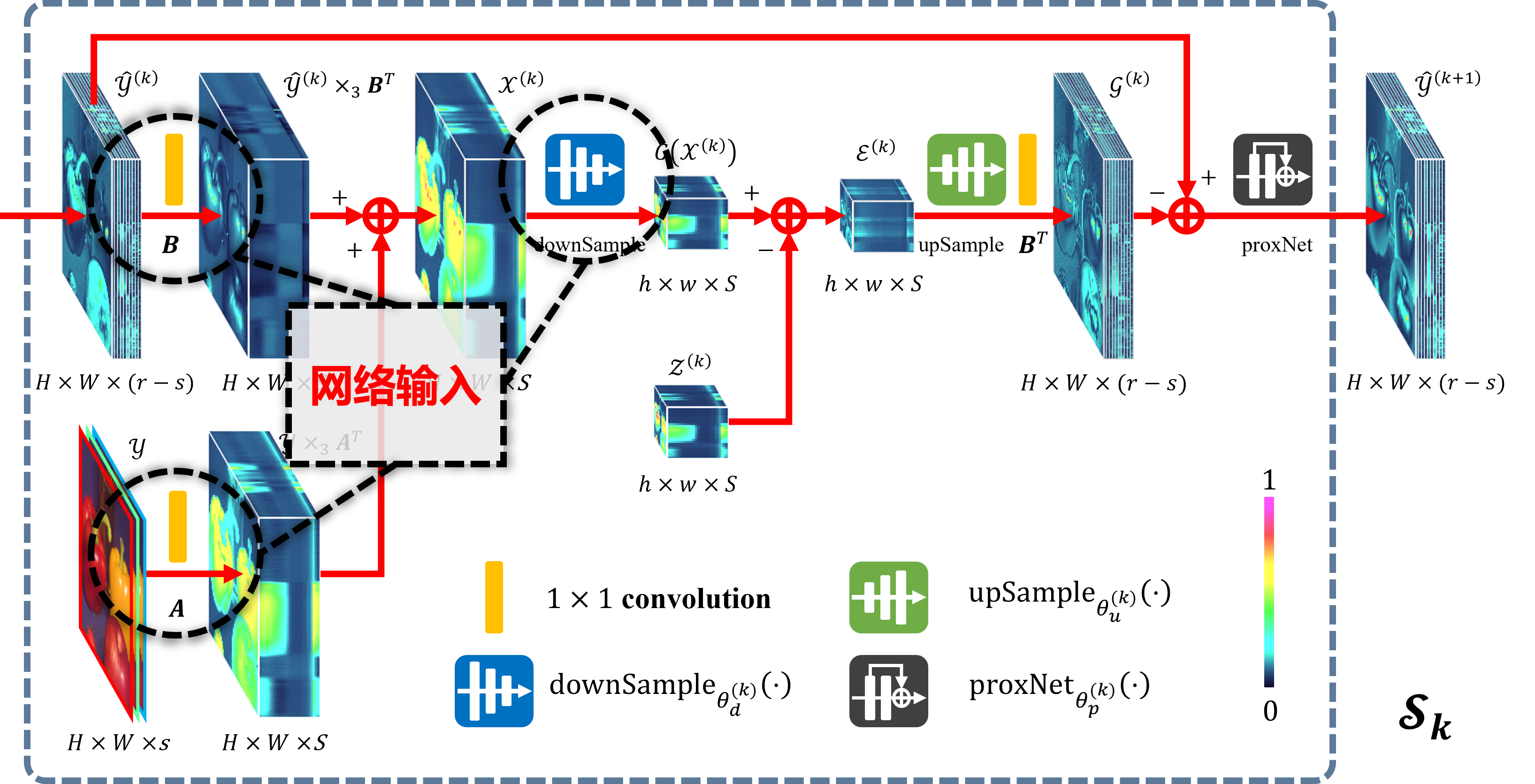 这样构造出来的网络解释性很好,关键是网络的输入也有了低秩性与观测模型一的保证,网络的结构如下: