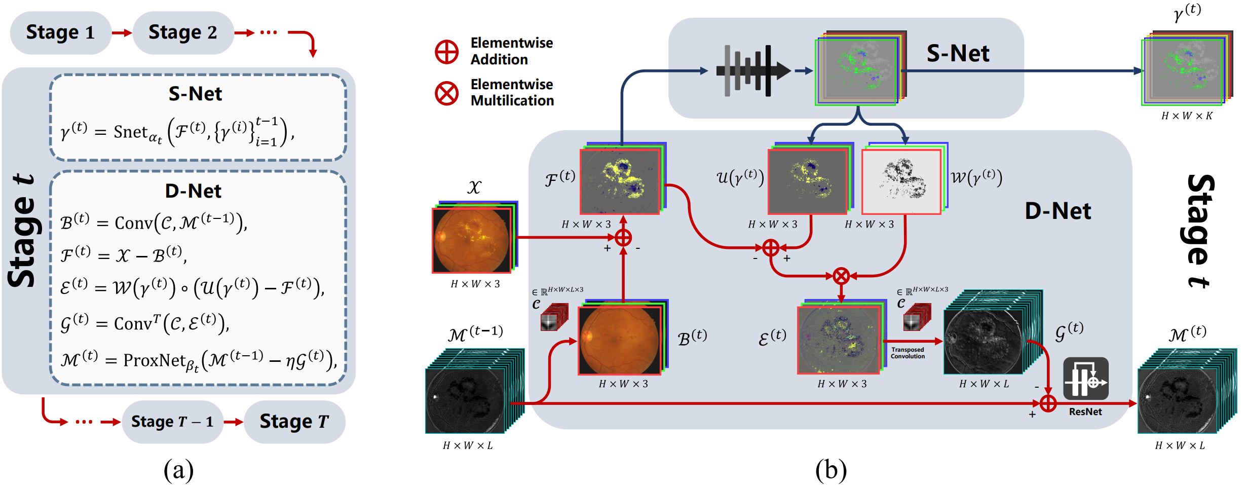 在得到眼底图像的概率模型后,可利用期望最大化(EM)算法对模型进行求解,将算法的迭代步逐一展开,生成对应的网络模块,称为Decomposition-Segmentation Network(DS-Net)。网络框架如下图所示: