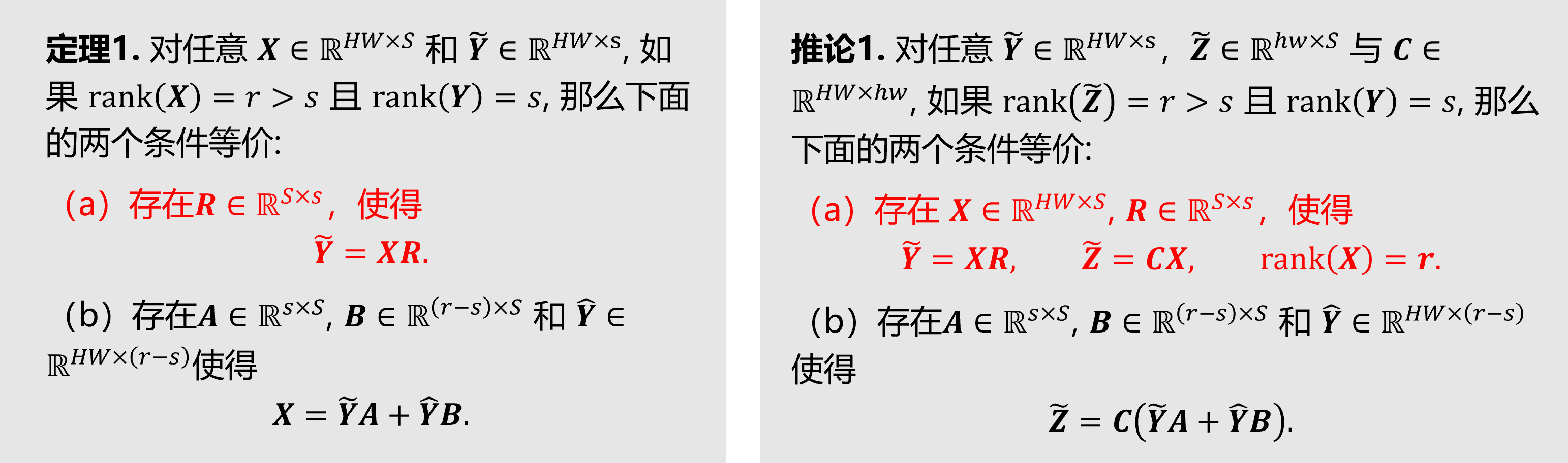 跳过很有趣味性的一系列探索和推导,直到我把高光谱低秩性的特点与上面的两个观测模型组合在一起,运用了大一和研一两个阶段的矩阵分析,得到了下面的两个结论: