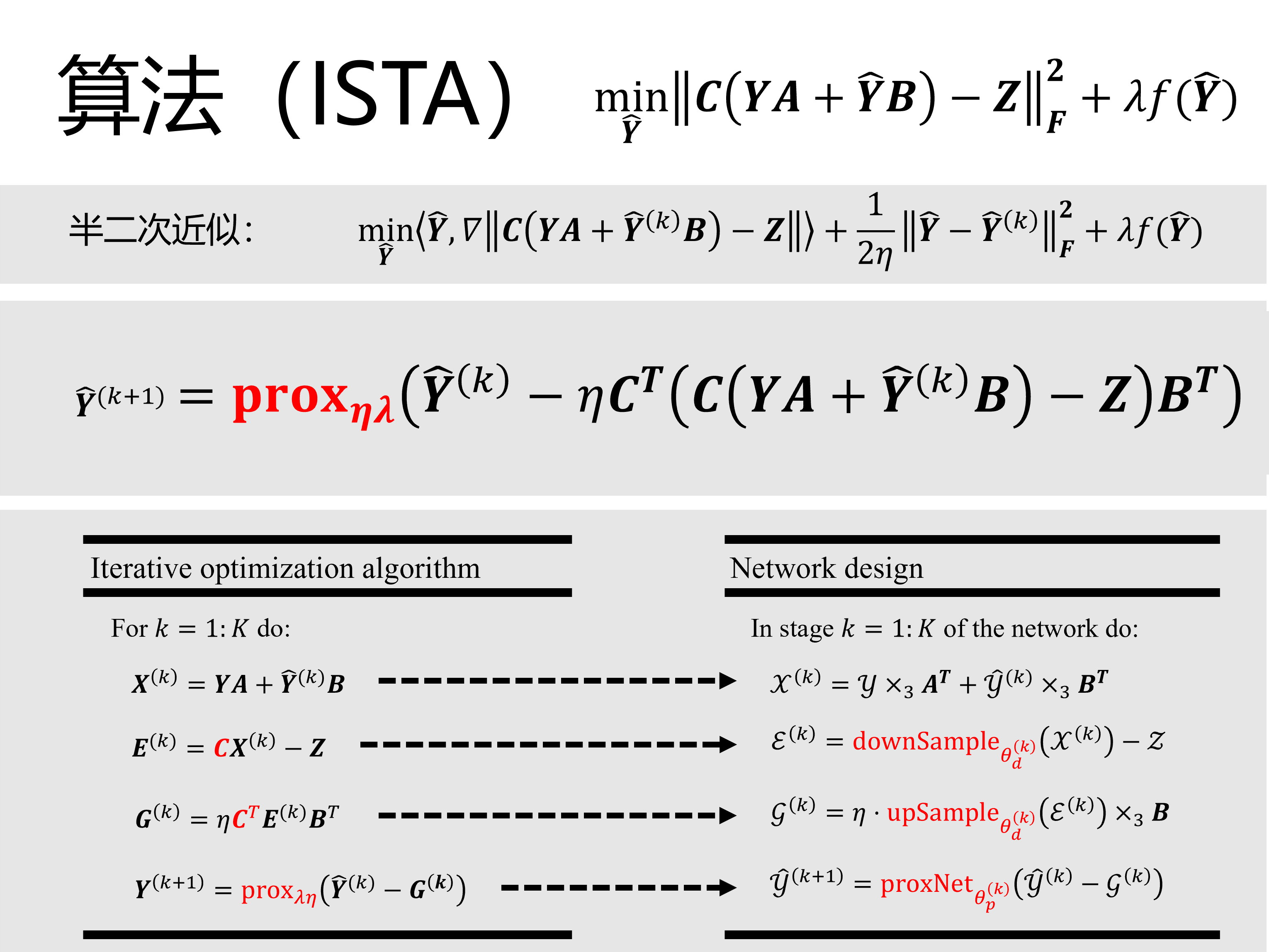 于是我们做了很多设计,得到一个自认为不错的处理流程,可以使结果符合低秩性,并且满足我个人对高光谱融合的所有想象,但最后我们发现,手工设计的流程其实和此我们熟悉的算法计算式是完全一致的。那么是否存在某个模型,它的算法就能满足我们心中最佳处理流程的需求?