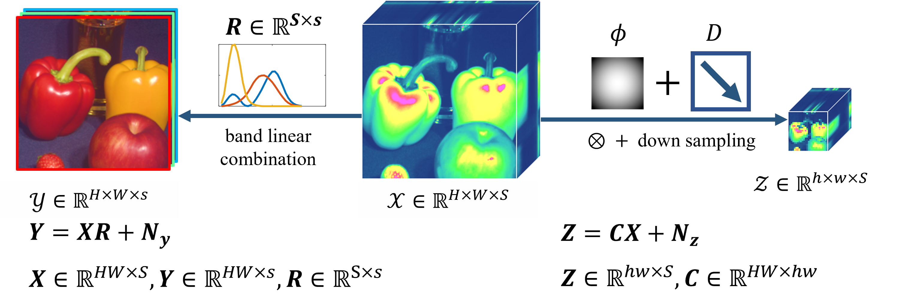 高清高光谱图像的直接观测成本很高,所以一般需只能观测到高清的低光谱图和低清的高光谱图。这个观测的过程已经有很成熟且精确的研究了,如下图所示: