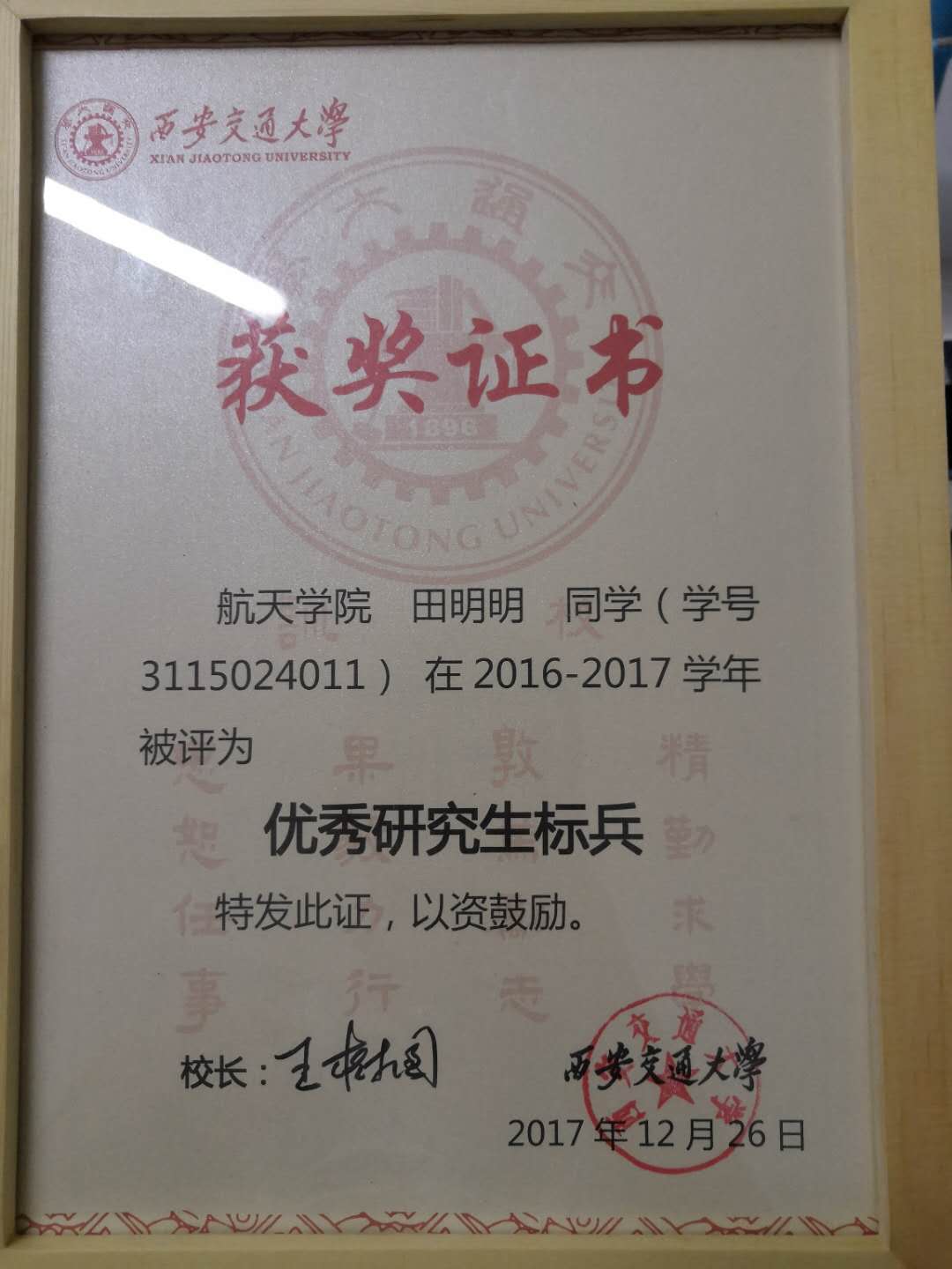 祝贺课题组田明明同学荣获西安交通大学“优秀研究生标兵”称号!