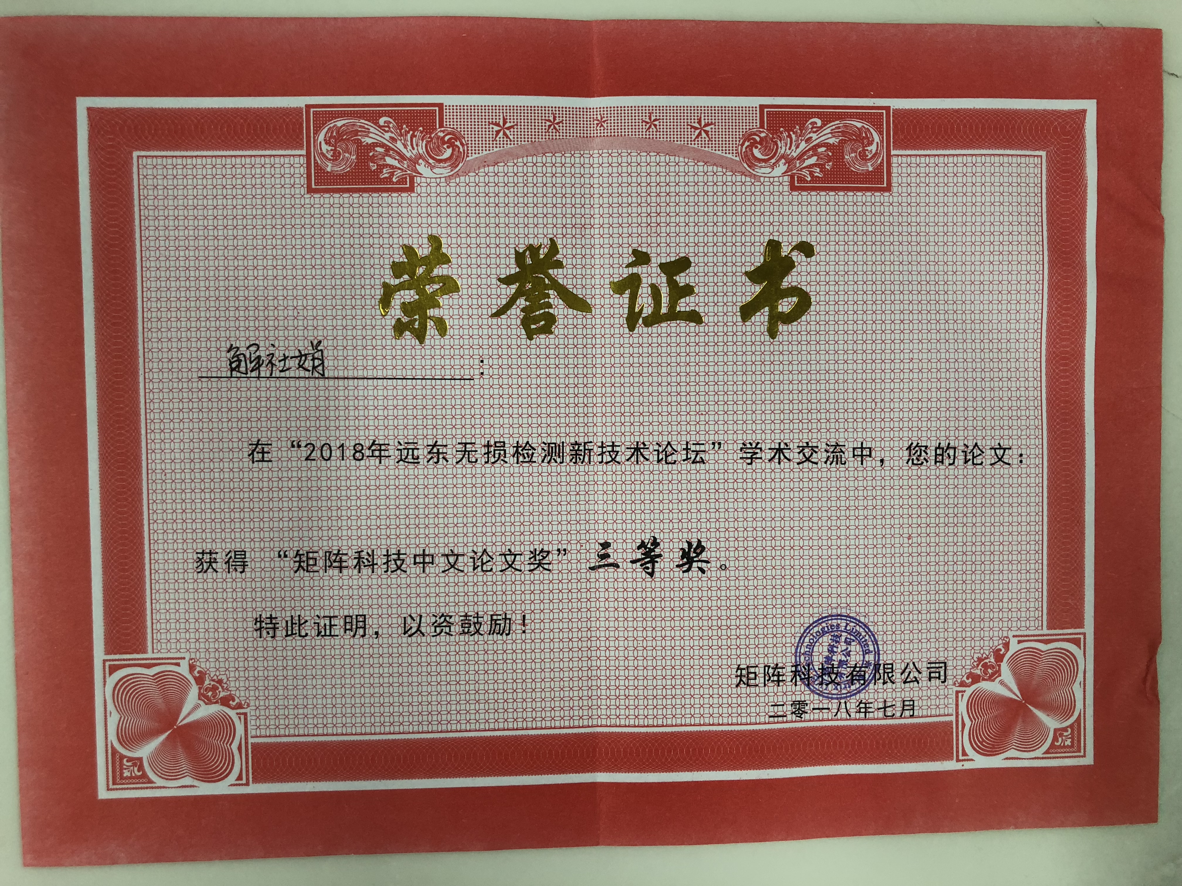 [5] 解社娟,2018远东无损检测新技术论坛学术交流中获得“矩阵科技中文论文奖”三等奖