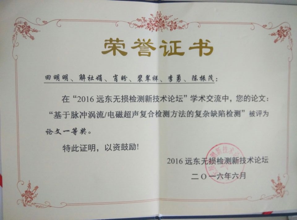 [3] 田明明,解社娟,肖盼,裴翠祥,李勇,陈振茂,基于脉冲涡流/电磁超声复合检测方法的复杂缺陷检测,2016年远东无损检测新技术论坛优秀论文一等奖,2016.(田明明为解社娟所指导硕士生)