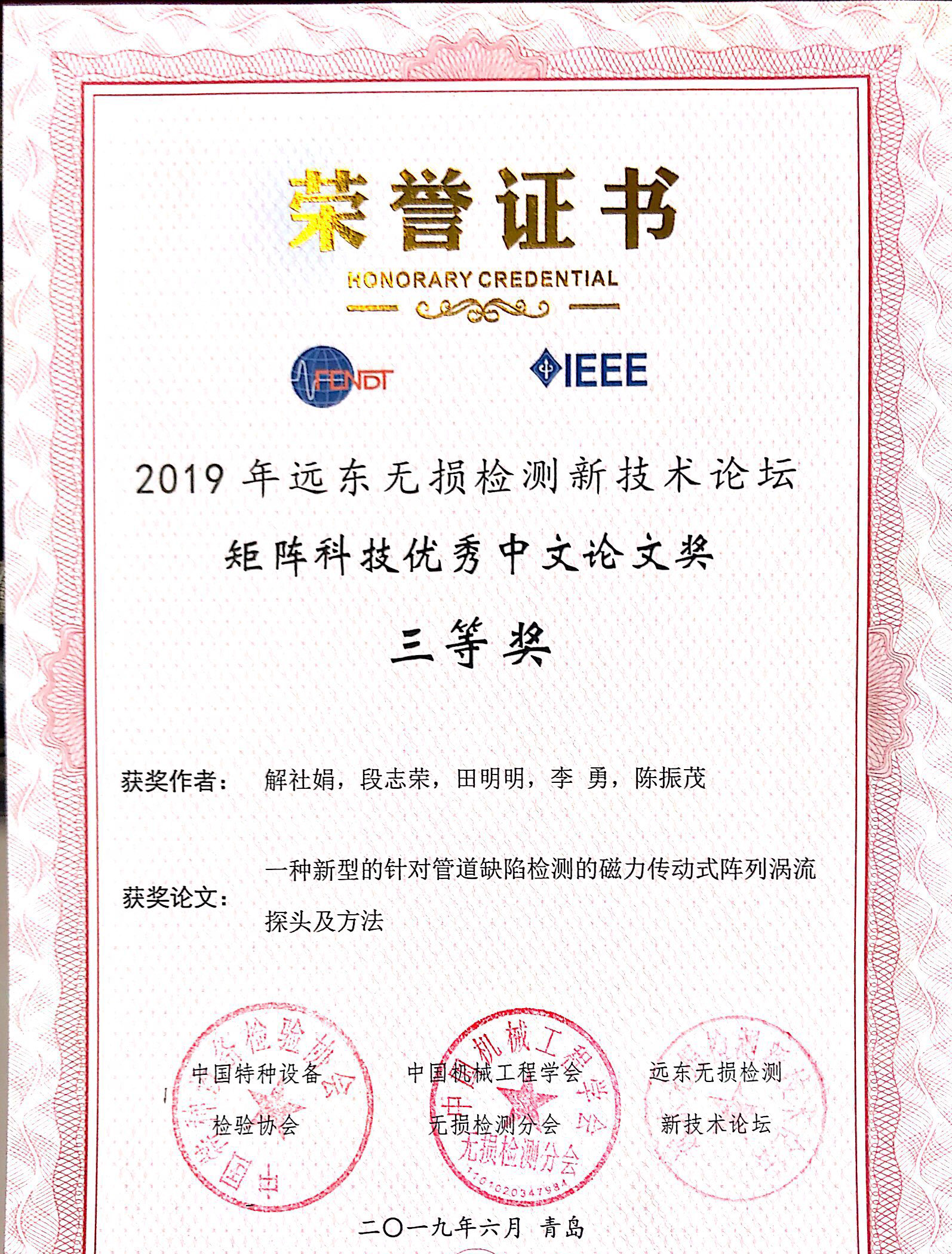 西安交通大学无损检测课题组研究成果获得国内外广大同行的一致认可,组内成员摘得多项奖项,其中解社娟副教授获得“矩阵科技中文论文三等奖”(论文题目:一种新型的针对管道缺陷检测的磁力传动式阵列涡流探头及方法),杨庆宁获得“主导科技优秀学生论文奖中文组一等奖”(论文题目:一种新型环向偏心涡流探头及其在小径管缺陷检测中的应用),向组内获奖的老师和同学表示热烈的祝贺!