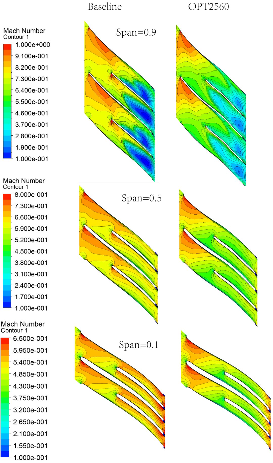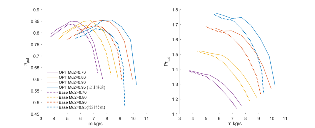 试验性能对比 本次优化设计及实验验证工作是对人工智能辅助支持的离心叶轮全三维优化方法的初次验证,试验件的加工由沈鼓完成,试验测试在西安交大-沈鼓研究院800kW试验台上进行。优化所使用的原型叶轮是经过试验验证的大流量系数高性能离心压气机模型级,包括进出口管路、叶轮、无叶扩压器及蜗壳,原型叶轮在设计转速下压缩机整机级效率可达83%。在对离心叶轮进行全三维优化后,在保持压比不低于原型级的情况下,设计转速下的最高级效率提升至86%。这一结果充分表明了基于人工智能辅助的全三维设计优化体系的优越性以及潜在价值。 本次的研究工作也是国际上首次系统地完成具有全三维造型的离心叶轮的气动设计优化及试验验证工作,表明我国的研究团队已经有能力将更加灵活、鲁棒及上限更高的优化方法应用于工程实际,提高各种设计条件下产品的国际竞争力。