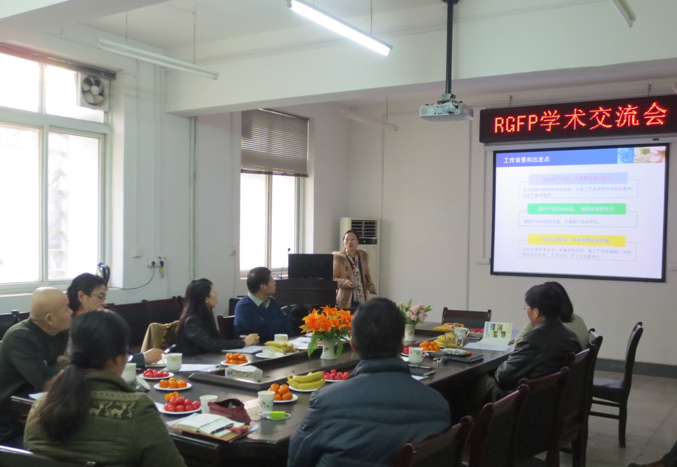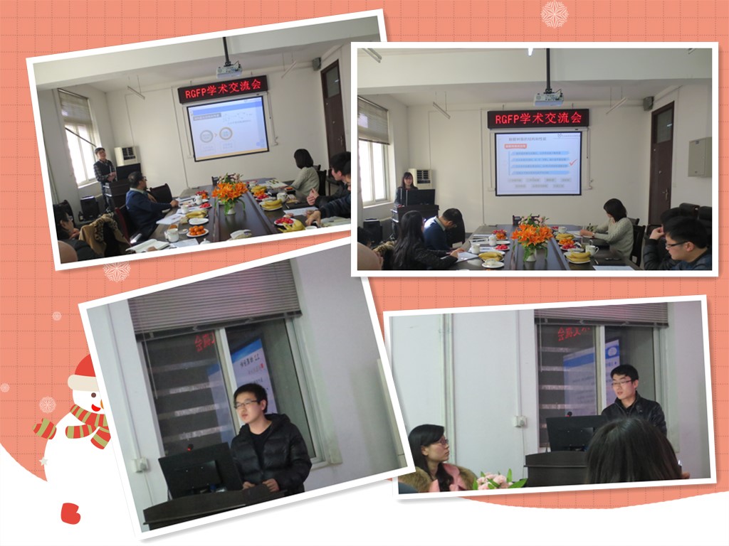 12月28日至29日,RGFP的师生济济一堂,在化学楼会议室总结2014年工作并进行了学术交流。李瑜博士、王勇和王淑娟等博士生汇报了他们在高性能丙烯酸树脂和涂料、酚醛树脂的结构与性能、低膨胀复合材料及纳米碳材料等多方面的内容。