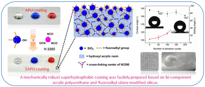 近日,研究组关于超疏水表面的研究成果发表于英国皇家化学会期刊Journal of Materials Chemistry A上(DOI: 10.1039/C5TA02780B),论文报道了一种更实用的超疏水涂层,这种涂层不仅具有良好的耐磨性、附着力和抗冲击性能,而且制备方便,具有广阔应用前景。